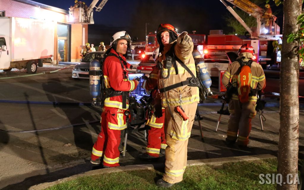 Le feu étant localisé dans la toiture du bâtiment multi commercial, les équipes se positionnent aux endroits stratégiques pour procéder à son extinction. Le PC demande une 3e alarme pour obtenir des effectifs supplémentaires, étant donné la grandeur du bâtiment.