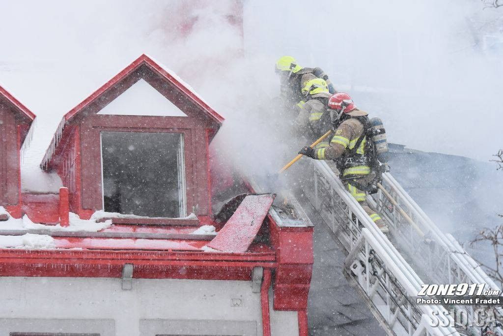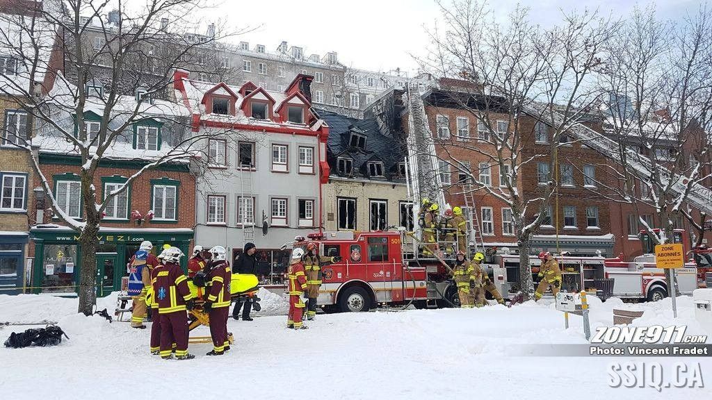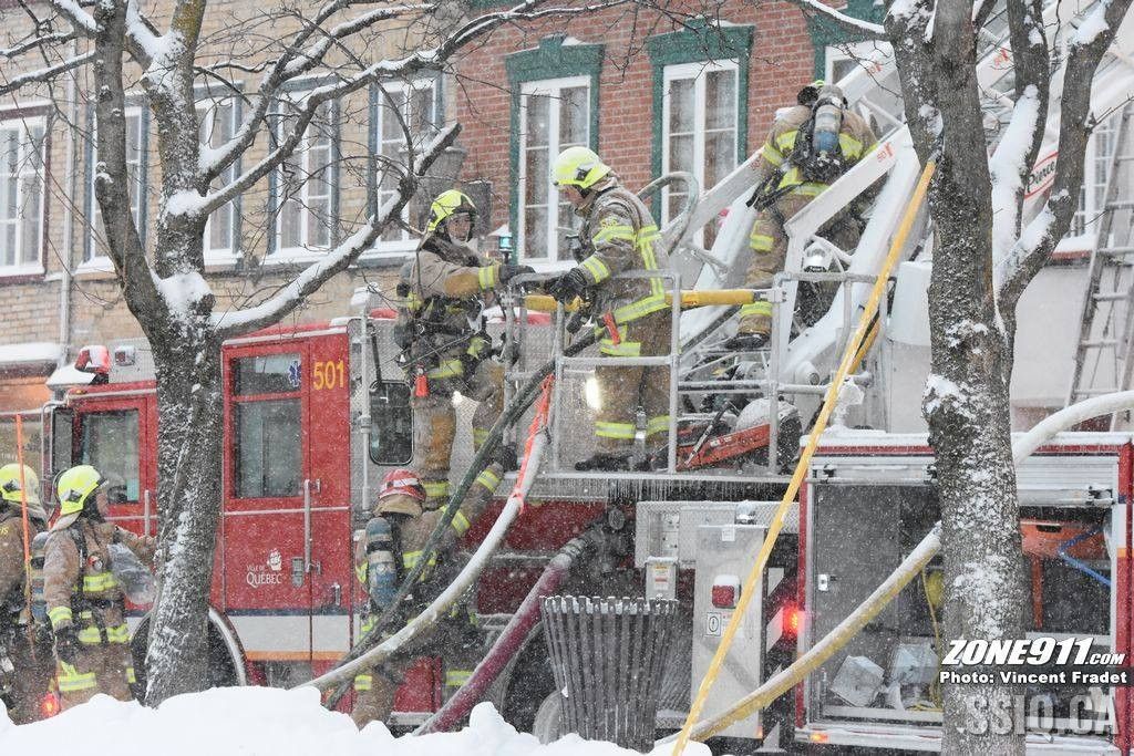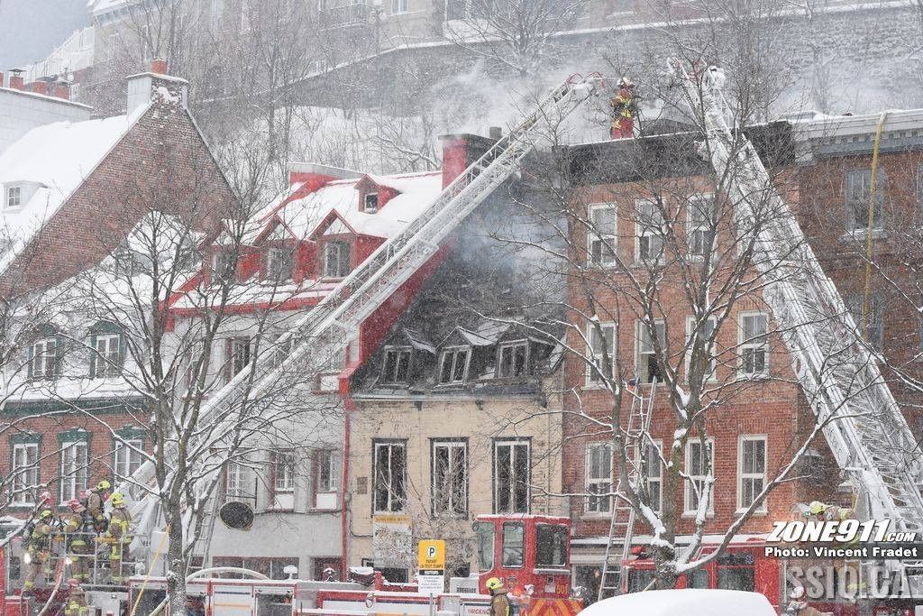 l'appel est d'abord entré au 143 rue Saint Paul par une compagnie d'alarme. Ensuite le locataire sur place a téléphoné au 911 pour mentionner une présence de fumée dans son logement.