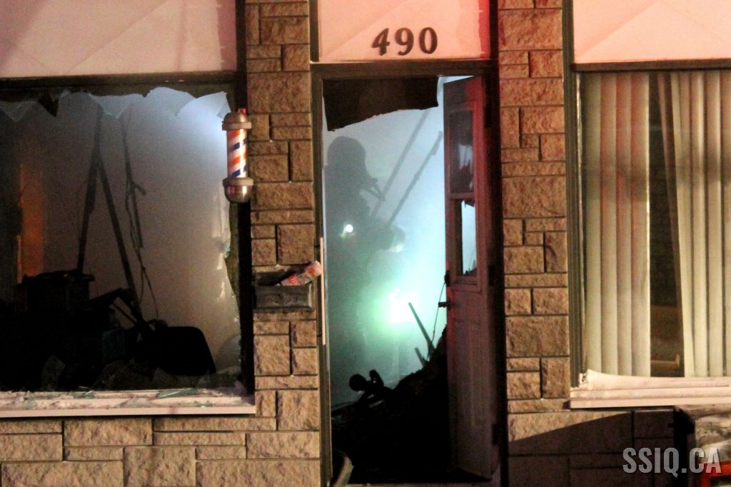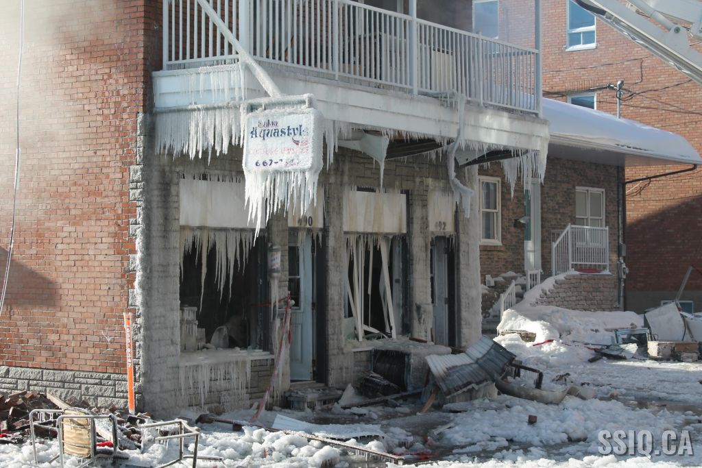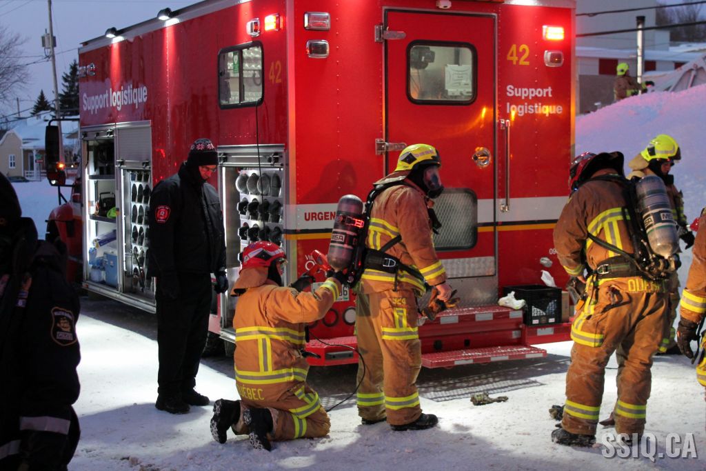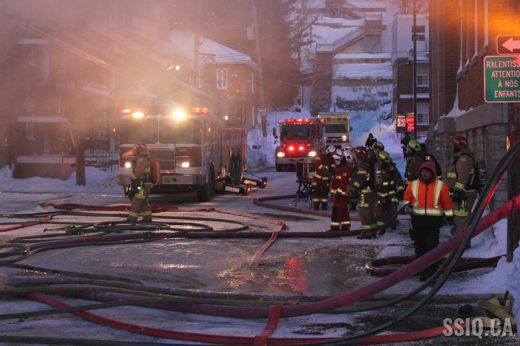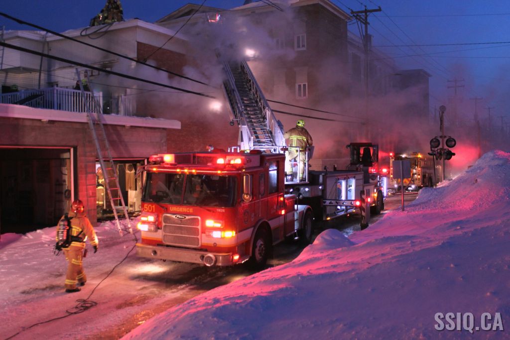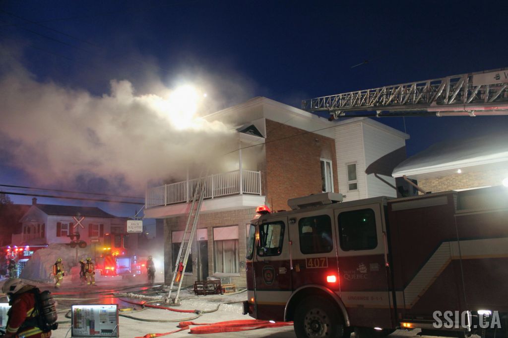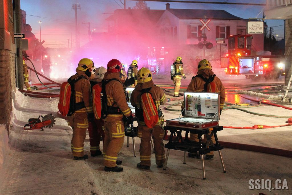 Rapidement sur place, les policiers confirment bel et bien la présence de fumée à l'extérieur du bâtiment. Avec les détails des policiers, le chef 123 donne l'intervention nécessaire. Arrivé sur les lieux , le 407 confirme que l'incendie est bien éclaté a l’arrière du bâtiment. Les flammes se propagent, rapidement les secours sont engagés à plein. À 8h08, le 123 ordonne un retrait stratégique dans tous les secteurs et que les équipes passent en mode défensif. Un délestage à distance a été demander à Hydro-Québec.