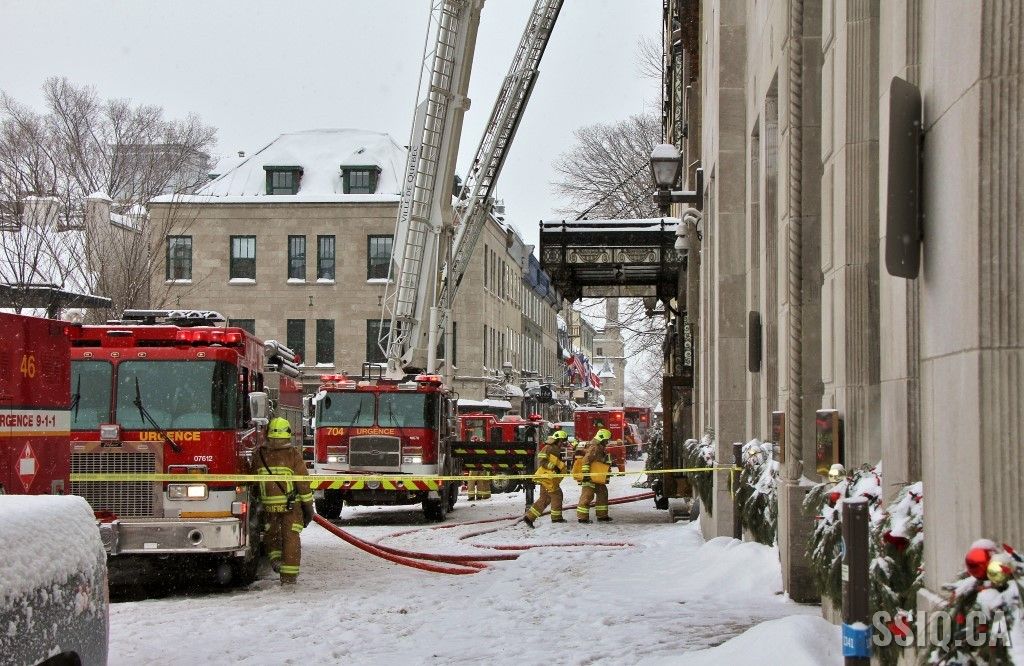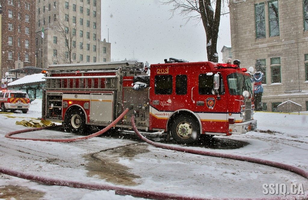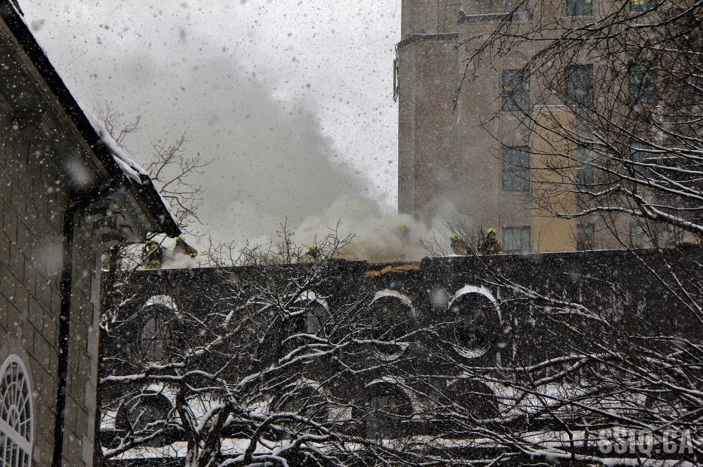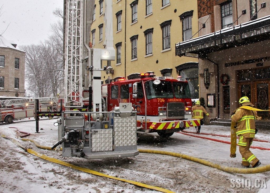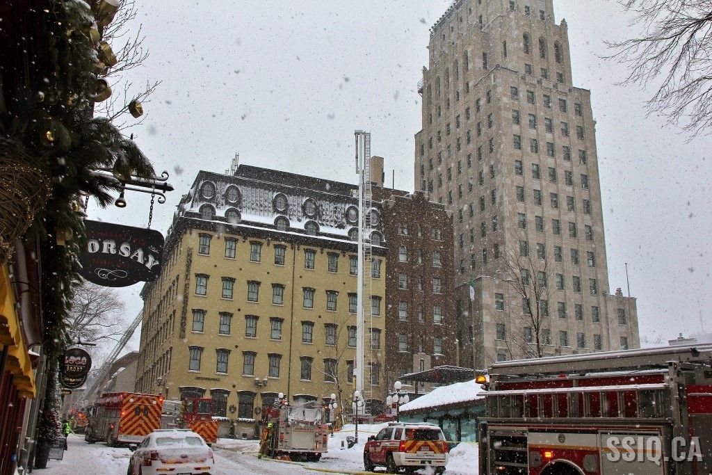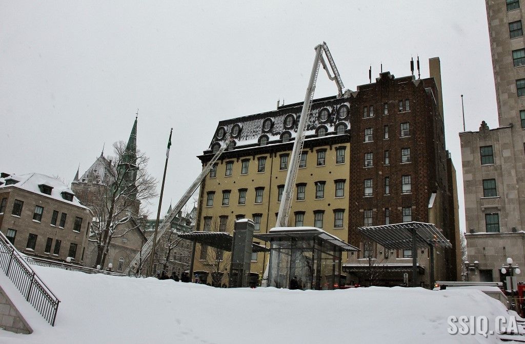 Rapidement sur place, l'équipe du 202 confirme qu'il y a de la fumée apparente au niveau du toit. Les équipes se déploient sur les étages pour constater que le feu fait bel et bien rage dans une salle mécanique située au 6e étage et qu'il se propage rapidement, une 2e alarme est alors demandée. Les flammes ont réussi à attaquer la toiture qui est difficilement travaillable étant donné l'âge du bâtiment. Plusieurs ouvertures ont été fait au niveau de la toiture pour contrôler l'incendie. Devant les risques élevés d'aggravation une 3e et 4e alarme sont sonnées.