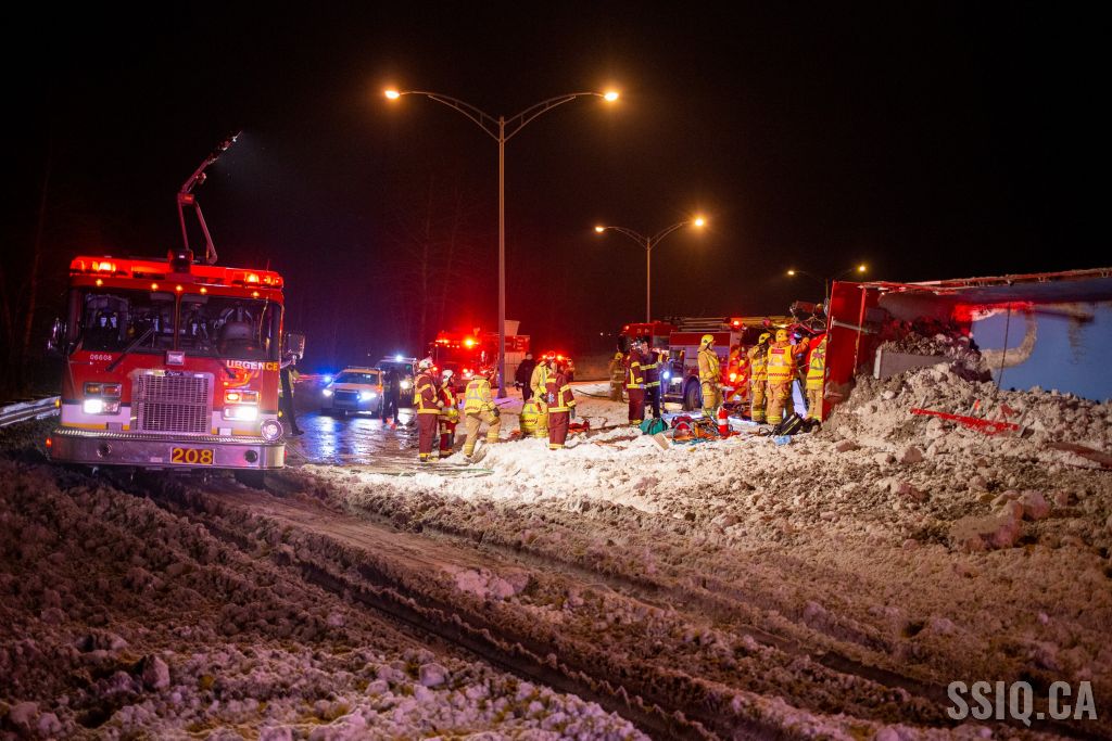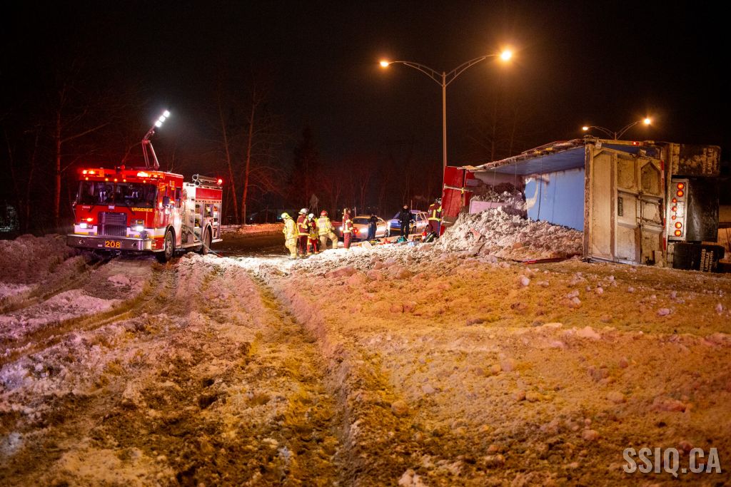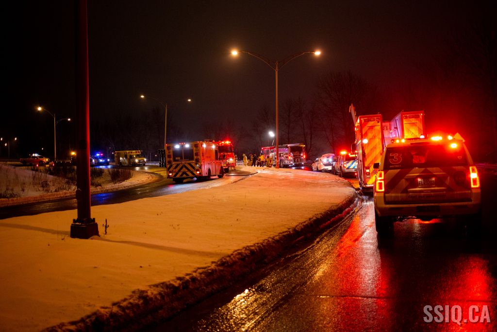 Les policiers sont les premiers à arriver sur les lieux. Le conducteur du camion est coincé dans la cabine et il y a écoulement d'essence. L'utilisation des outils de désincarcération sera alors nécessaire, et à la demande du chef Fiset (133), l'unité 913 spécialisée en matières dangereuses est répartie étant donné l'écoulement d'essence.