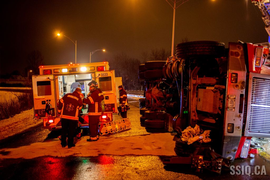 Le conducteur du camion impliqué dans l'accident est pris en charge par les paramédics, et transporté dans un centre hospitalier de la région.