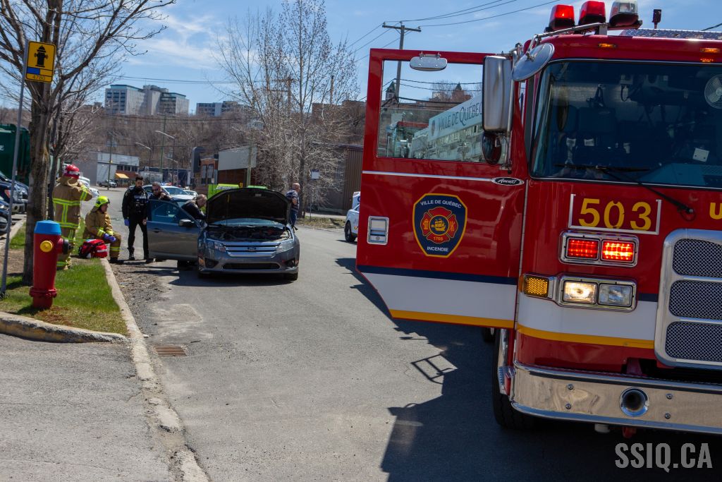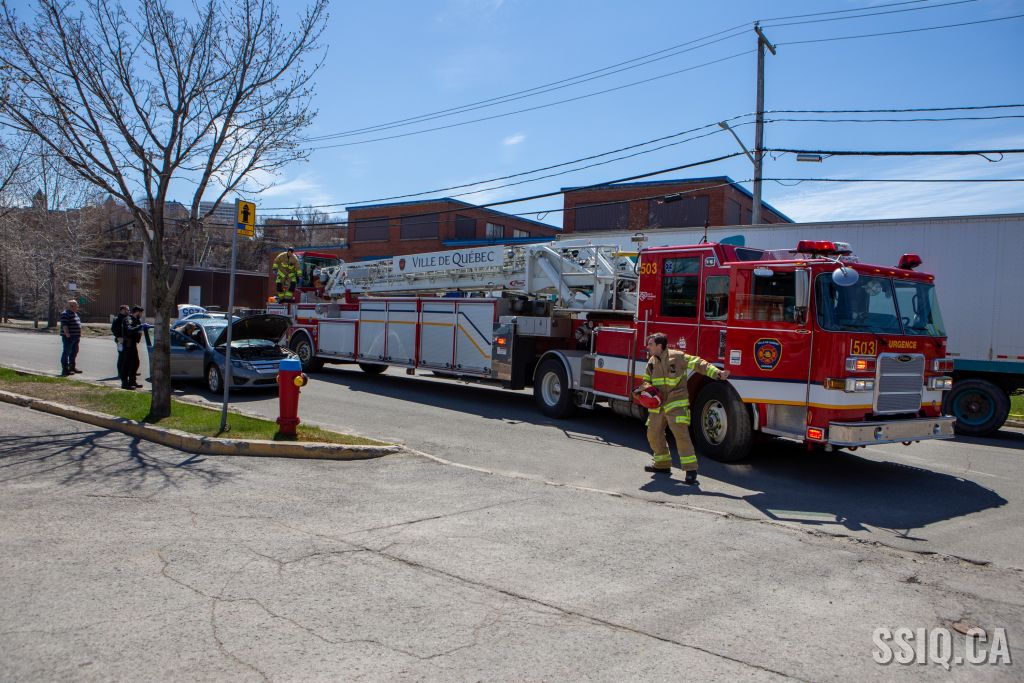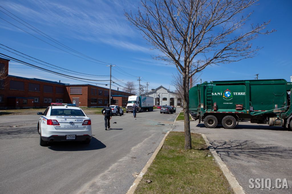 L'appel logé au 911 mentionne un accident entre un véhicule et un camion à ordures. Le passager du véhicule est blessé et possiblement coincé.
