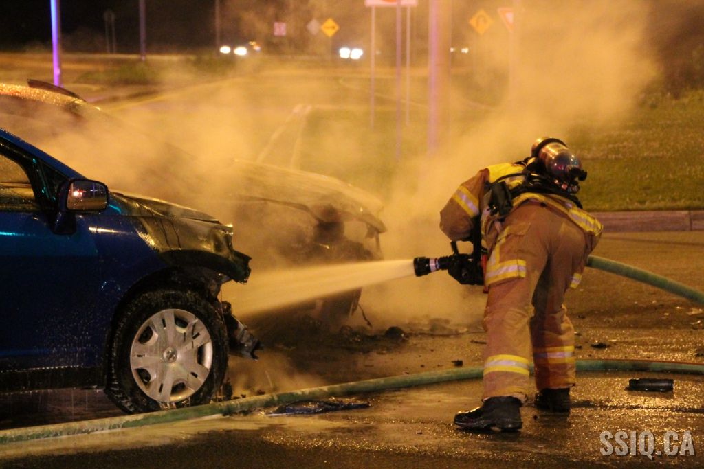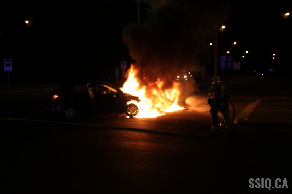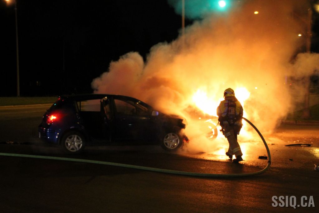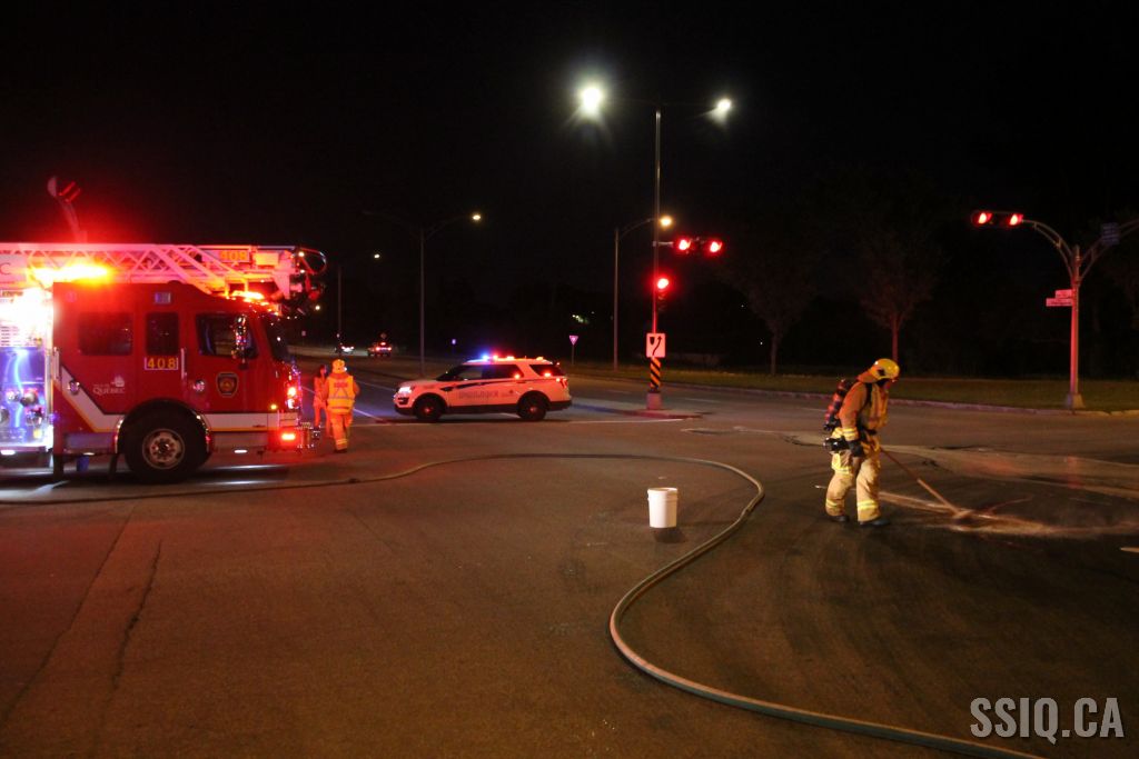 En fin de soirée, un accident entre 2 véhicules est survenu à l'intersection du Boulevard Jean-Talon Ouest et de la rue du Périgord. Avec la fuite de liquide, les véhicules ont pris en feu.