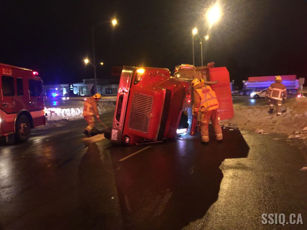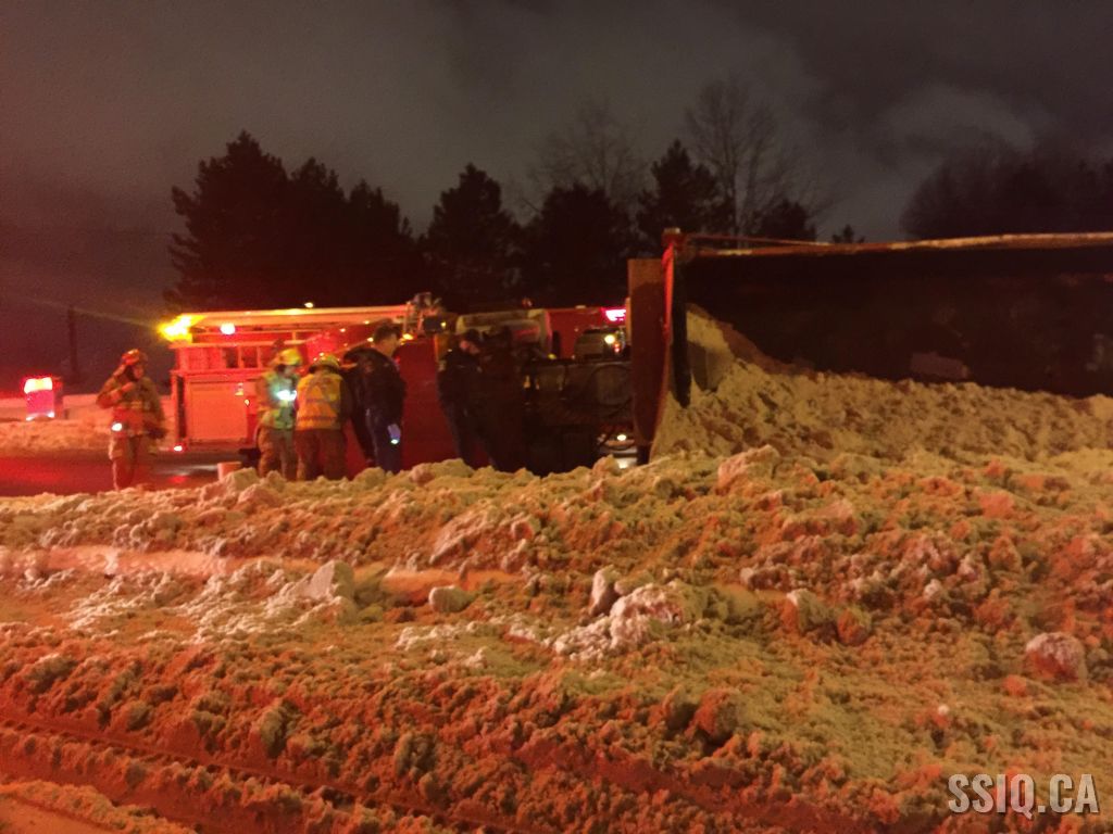 305, 203. Les pompiers sont intervenus pour un camion transportant de la neige qui s'est renversé sur son côté. La première unité sur les lieux annonce que les mâchoires de vie ne sont pas nécessaires pour sortir la victime.
