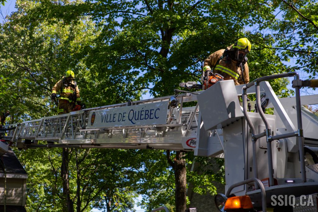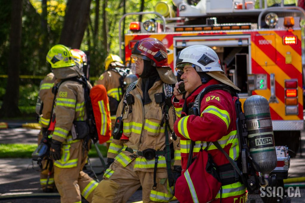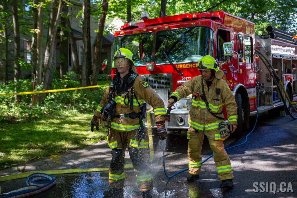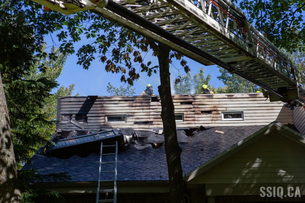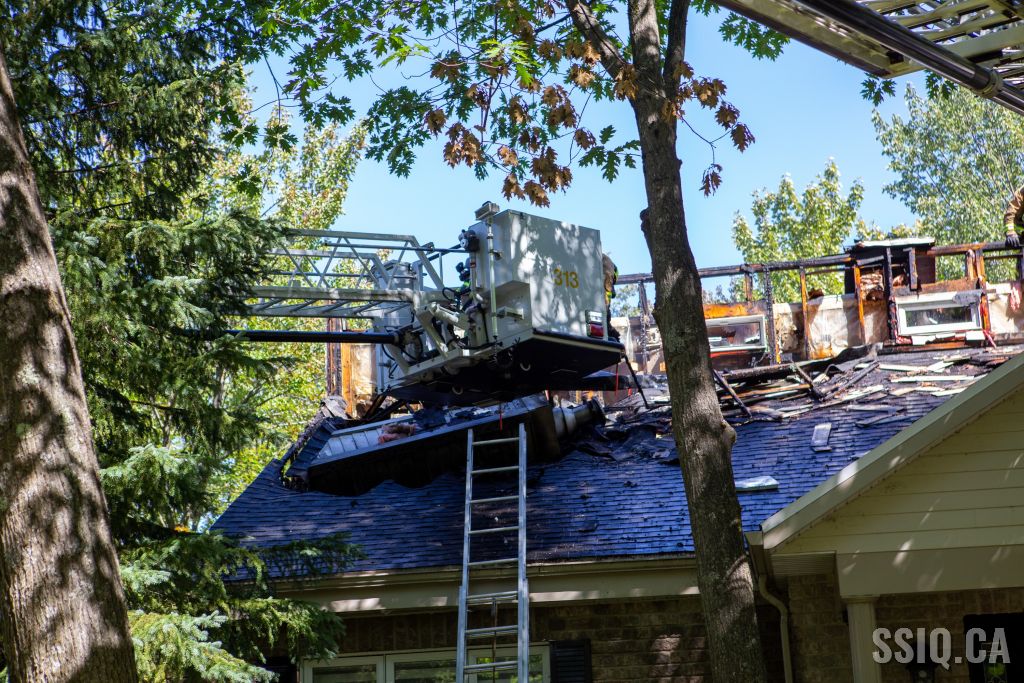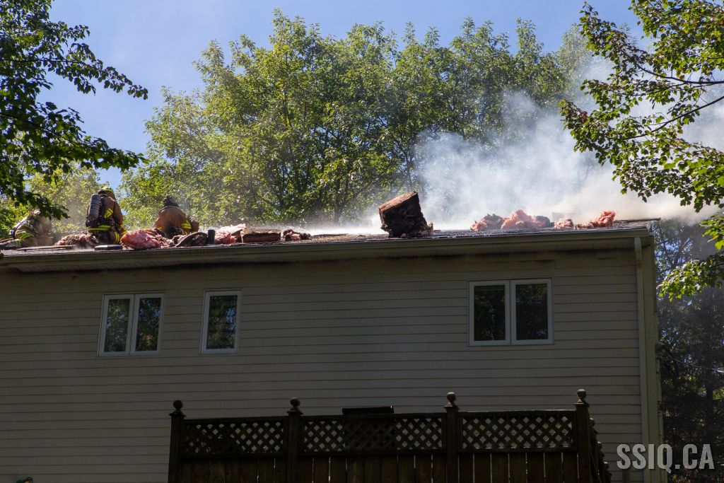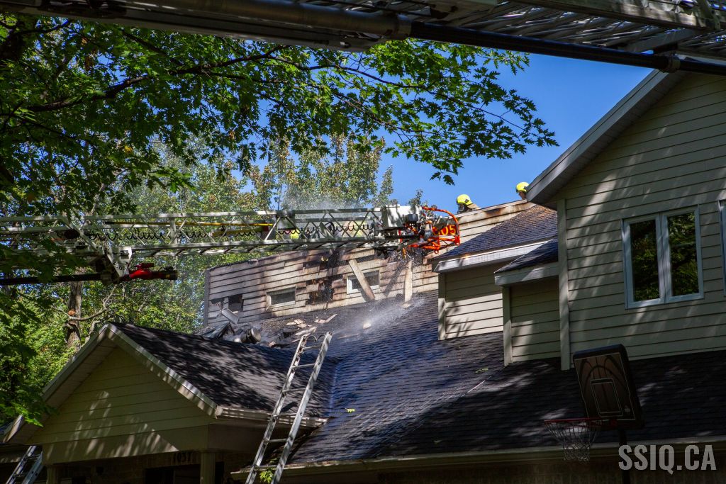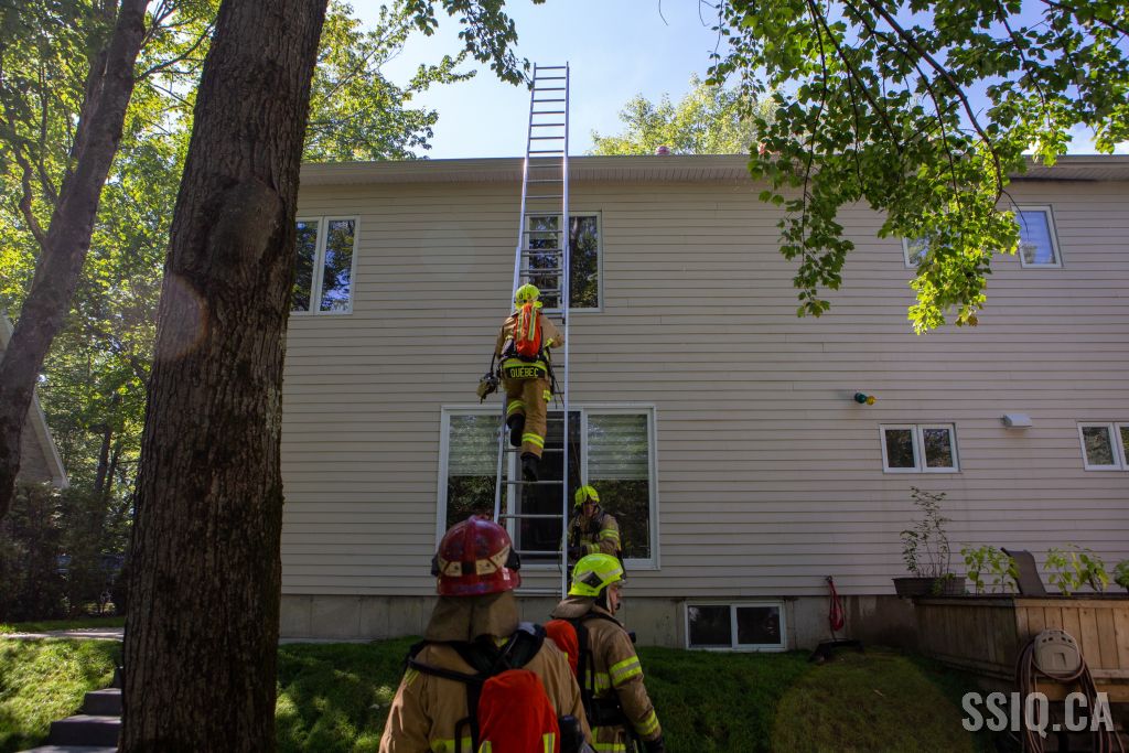 De nombreuses ouvertures sont effectuées par des équipes au toit et à l'intérieur de la résidence pour atteindre les flammes. Des périmètres d'exclusion sont faits à l'avant et à l'arrière de la résidence pour la chute des débris.