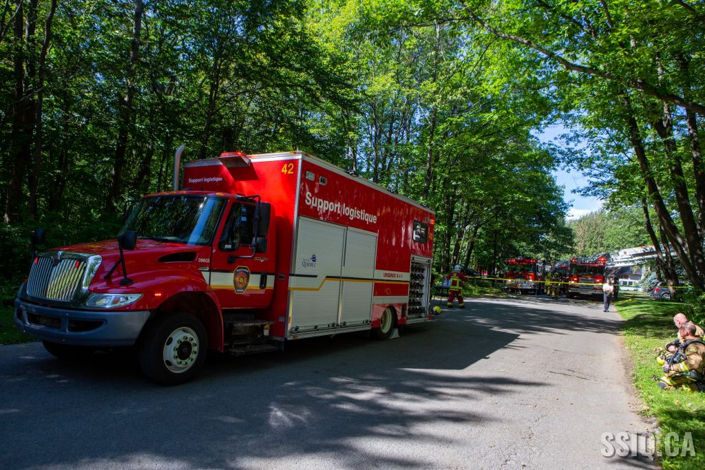 L'appel à la centrale 911 est logé par une personne sur place. Les détails font mention de flammes dans une cheminée et sur un mur extérieur de la résidence.