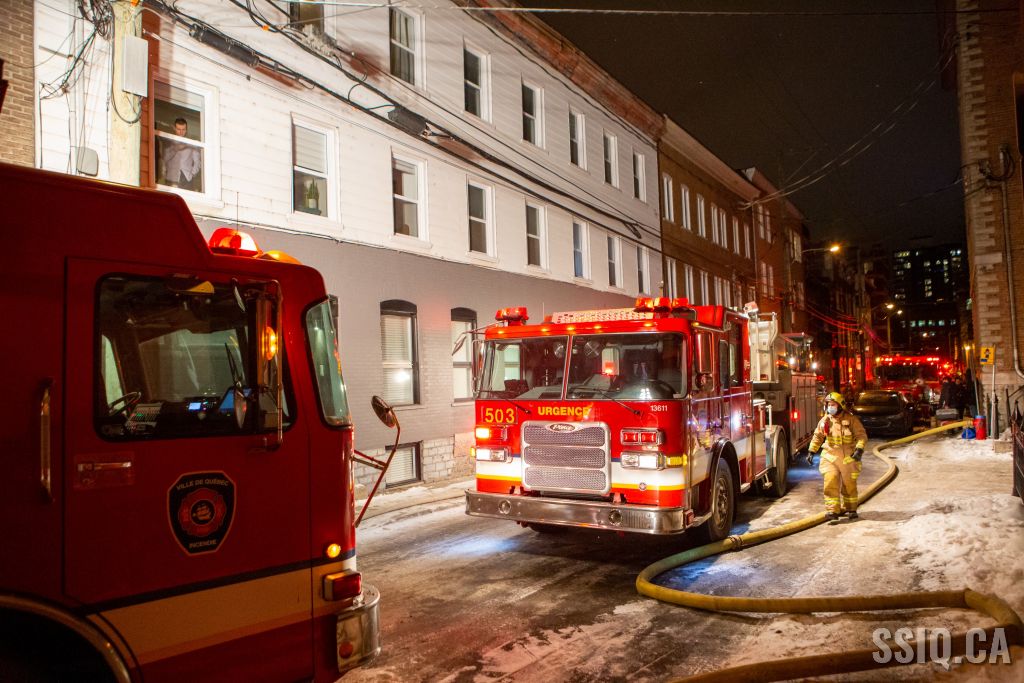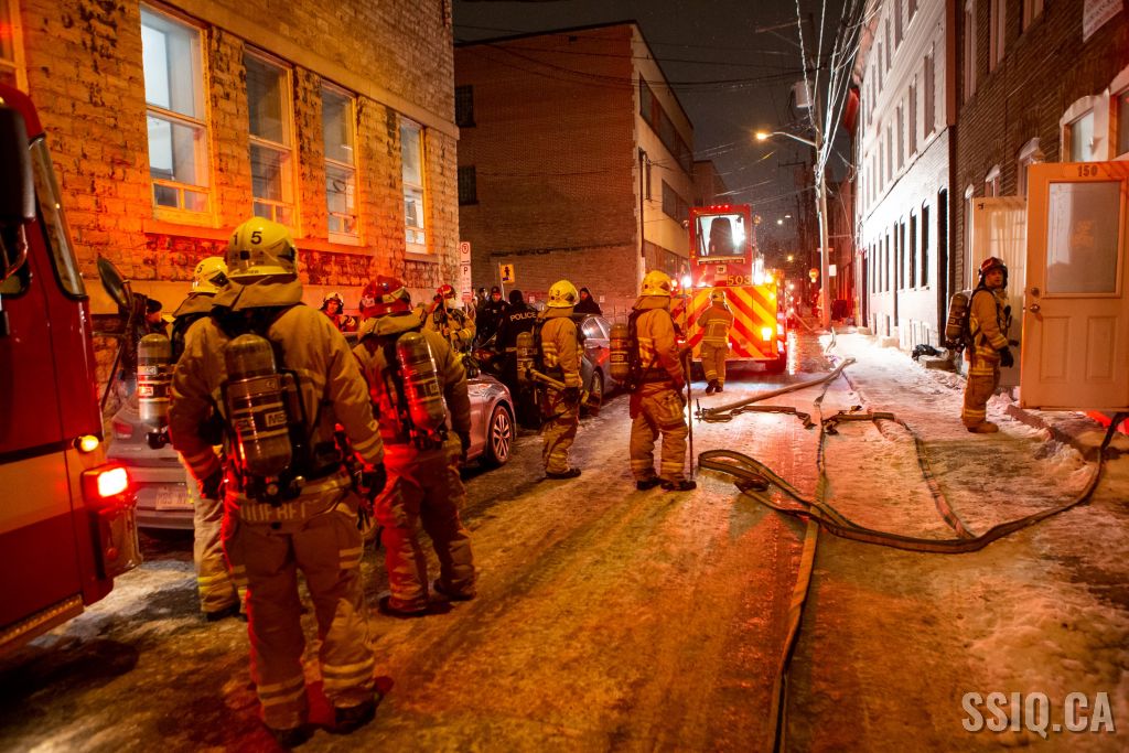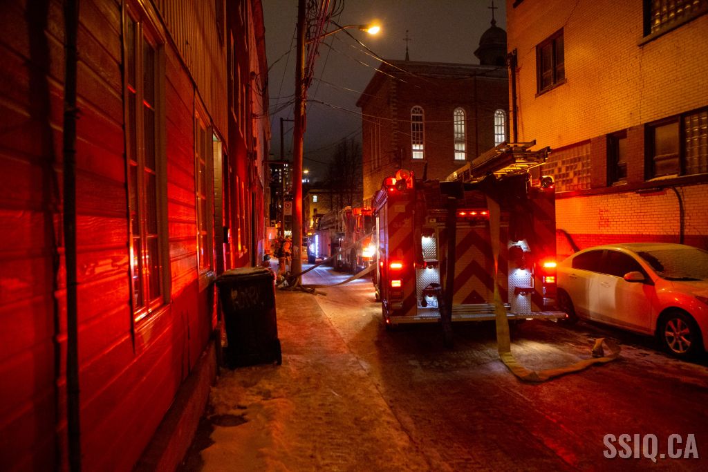 Sur place, l'équipe du 203 se positionne sur la rue du Roi, derrière l'immeuble impliqué, pour établir un premier jet. Les flammes attaquent la structure de bois des balcons et la situation semble de dégrader. Par précaution, le chef Coulombe (142) ordonne une 2e alarme.