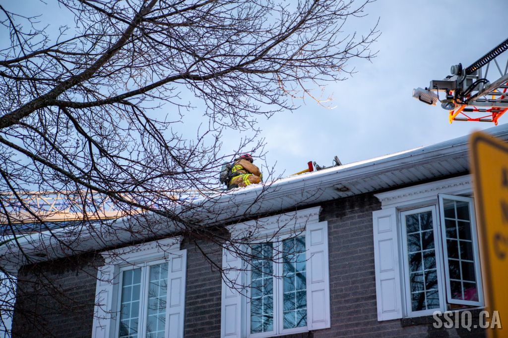 Alors que que les équipes sont en direction, le chef 144 déclare l’intervention nécessaire. La colonne de fumée est visible à distance. Sur place, la 2e alarme sera donnée rapidement. Le feu est éclaté au toit et une attaque agressive est faite pour éteindre le foyer à partir du toit, du 2e étage, et par l'arrière de la résidence.