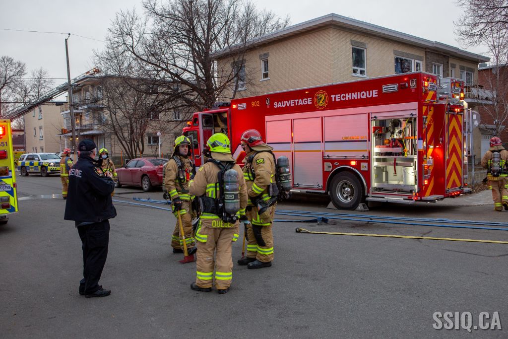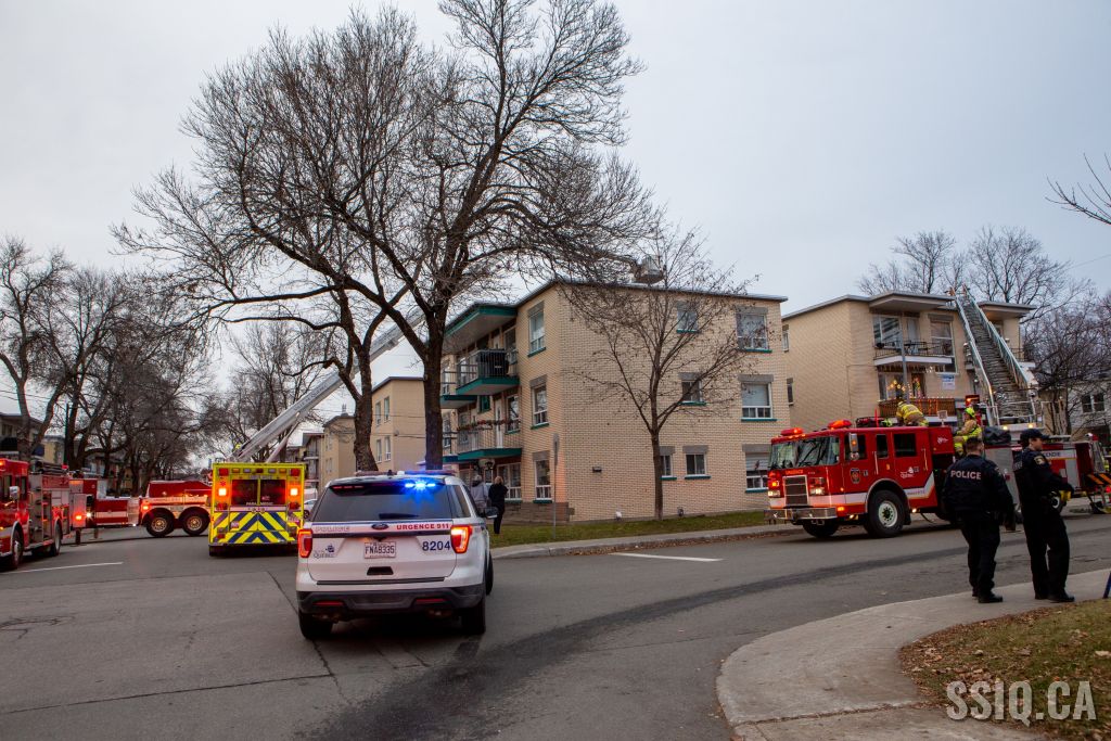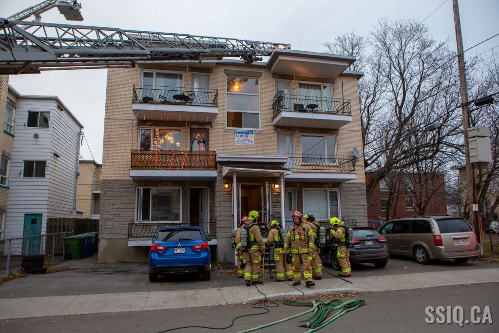 L'appel est logé à la centrale 911 par une résidente de l'endroit. Les détails font mention d'un feu sur une cuisinière. Le superviseur ambulancier est le premier à arriver sur les lieux et confirme la fumée noire visible à l'extérieur et des gens coincés sur un balcon du dernier étage de l'immeuble. Avec ces informations, le chef Savard (123) ordonne la 2e alarme alors que les équipes sont en route vers l'intervention.