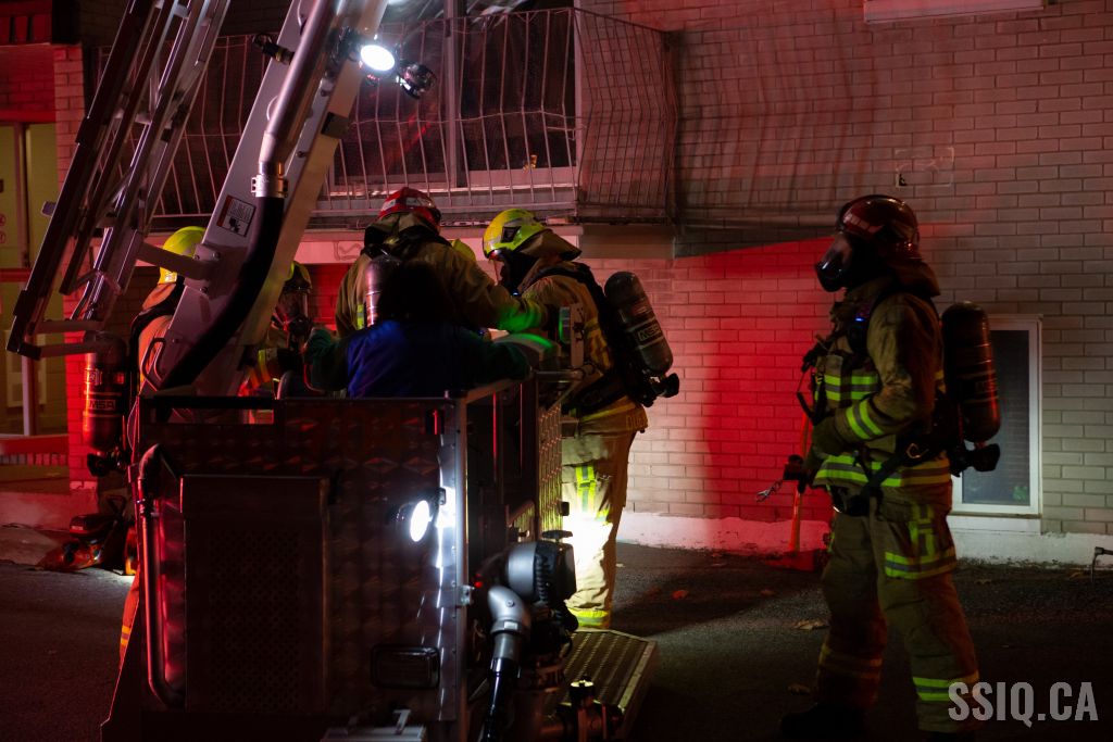 En début d'intervention, un locataire de l'immeuble est incommodé suite a une inhalation de fumée. De plus, l'évacuation d'un couple doit être faite du 3e étage à l'aide de la nacelle du 704. Ces gens sont tous pris en charge par les paramédics.
