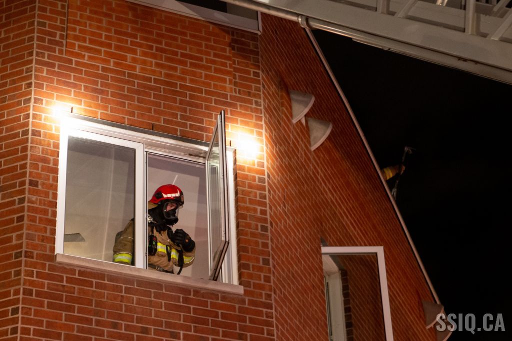 L'appel est logé à la centrale 911 par un résident de l'endroit. Les détails font mention d'une sécheuse à linge en feu dans un appartement du rez-de-chaussée, et qu'il y a possibilité que des gens soient encore présents dans le bâtiment.