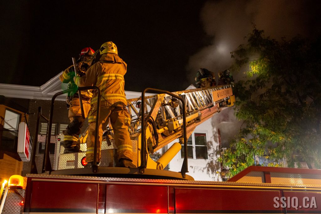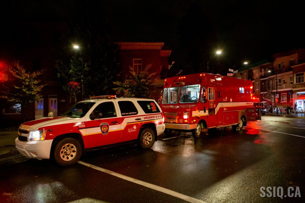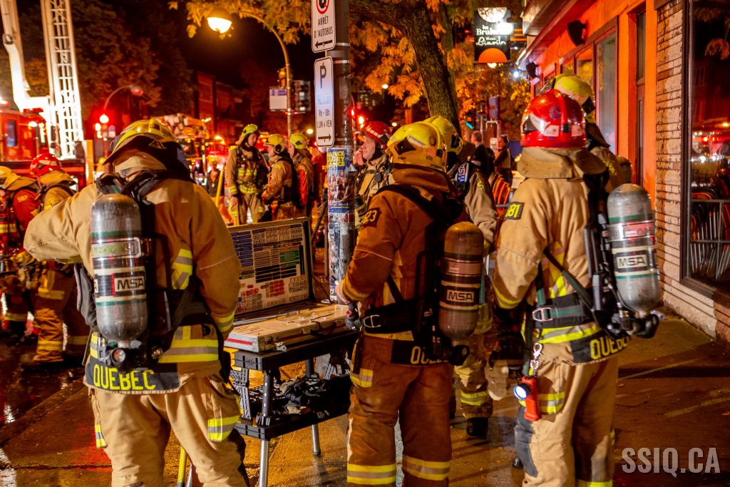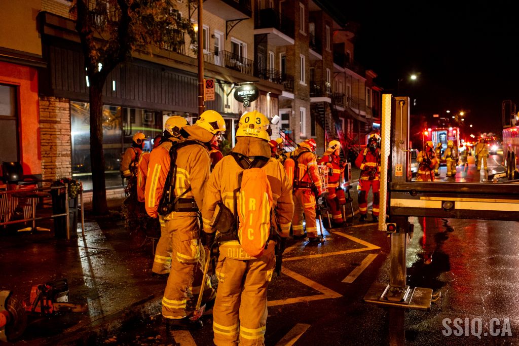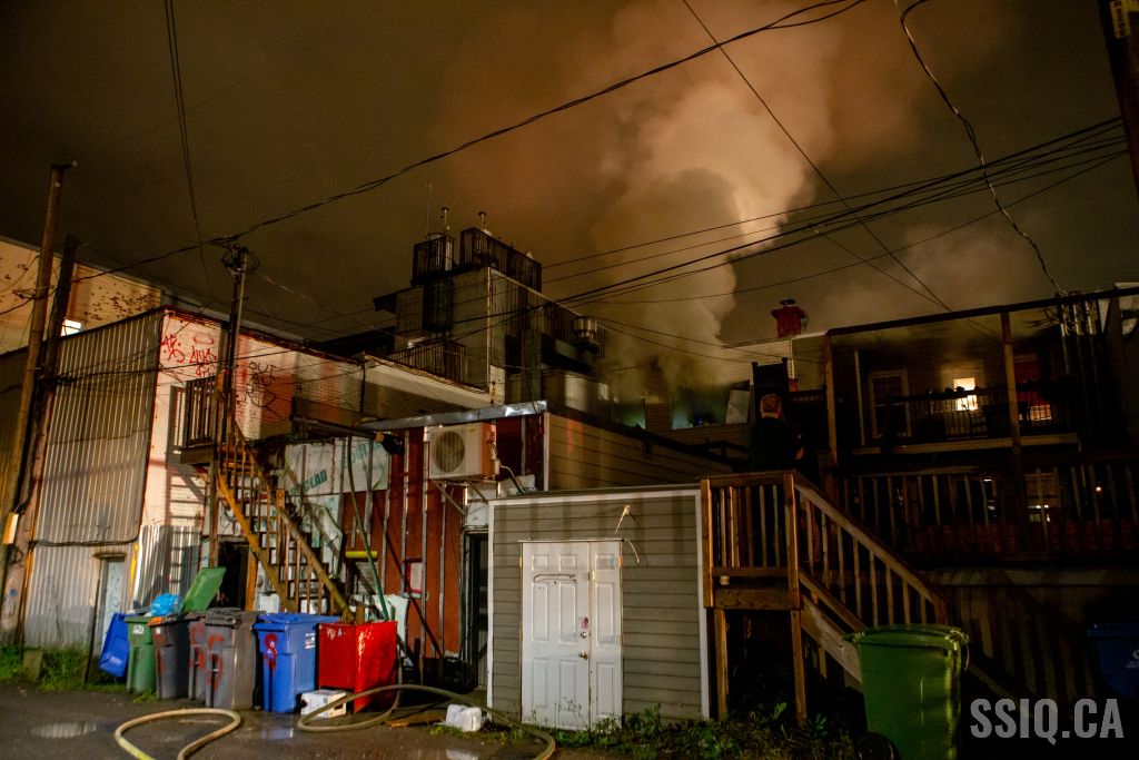 Les équipes procèdent à une attaque rapide. Le feu est dans la structure, dans l'assemblage d'un plancher. Les conditions de fumées se détériorent rapidement, le chef Savard (123) ordonne une 3e alarme.