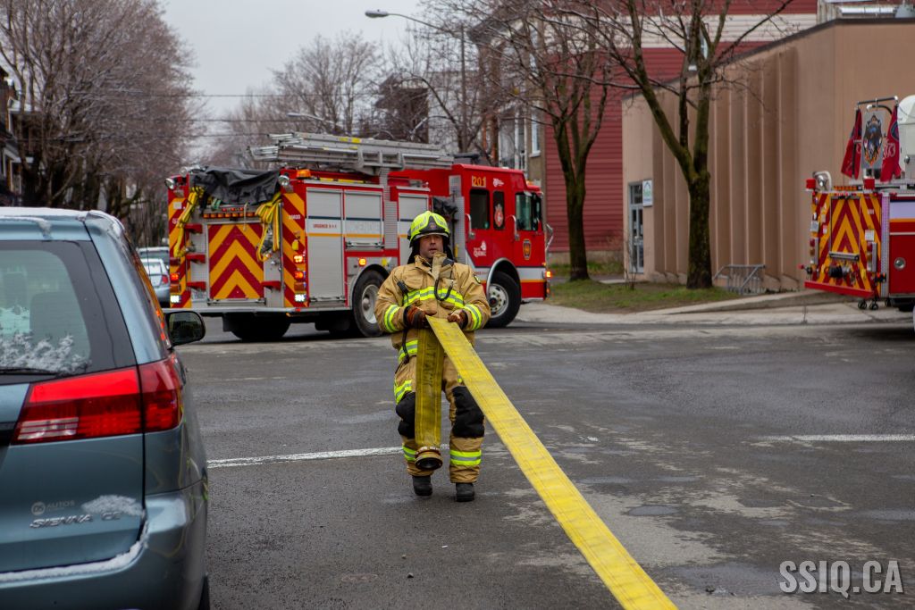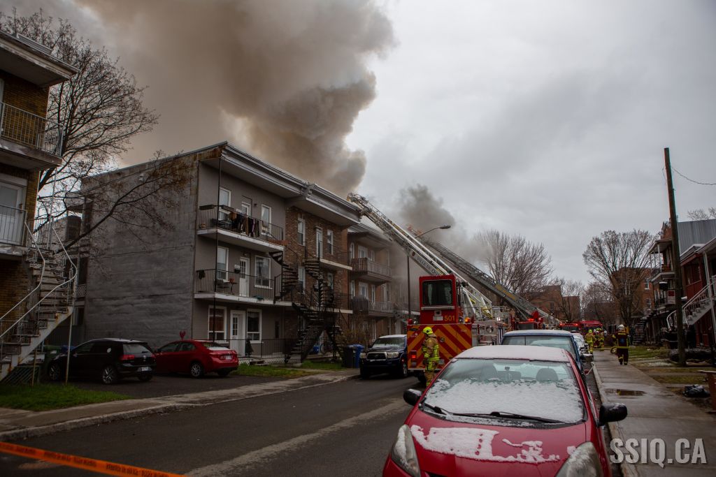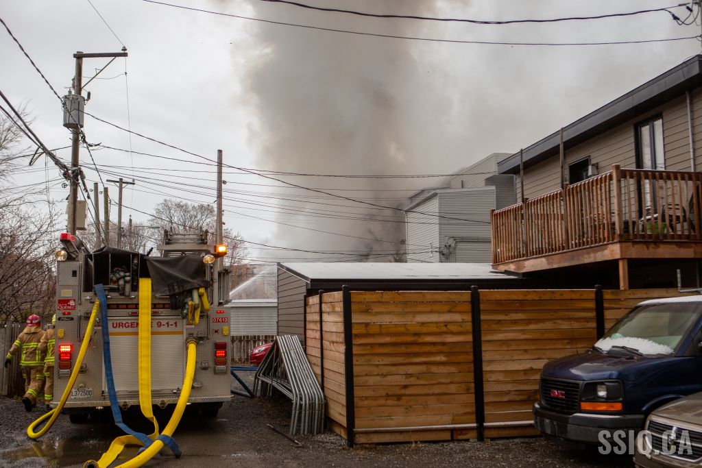 L'appel est logé à la centrale 911 par un résident de l'endroit. Les détails font mention de feu sur le balcon arrière chez son voisin. La fumée est dense et les flammes attaquent les murs.