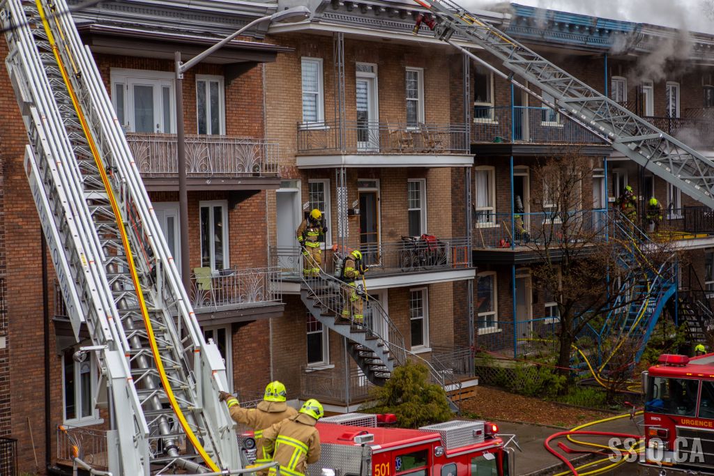 Les flammes font leur chemin dans la structure des bâtiments. Des ouvertures sont faites dans les murs, plafonds et au toit pour enrayer la propagation des flammes. Pendant ce temps, des équipes procèdent à l'installation de bâches dans certains appartements pour protéger les meubles de l'écoulement d'eau.