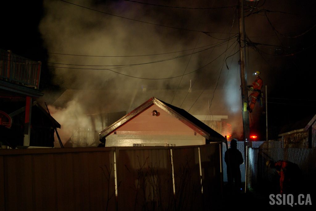 Des fils électriques sont impliqués dans l'incendie et l'officier demande un délestage à distance. Pendant ce temps, l'incendie s'est propagé au second garage.