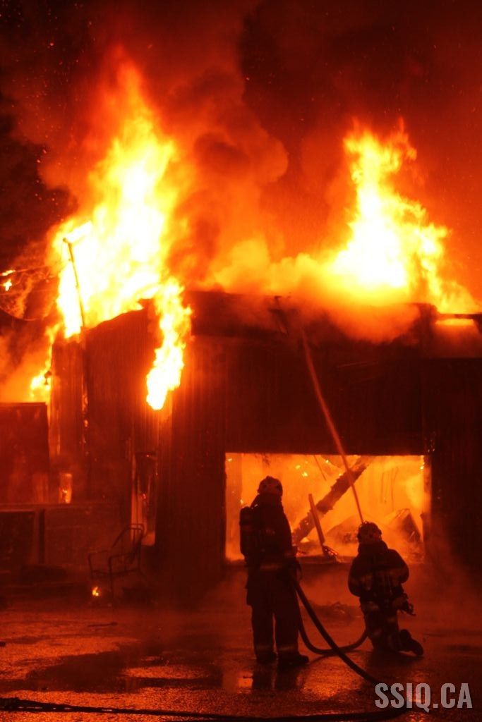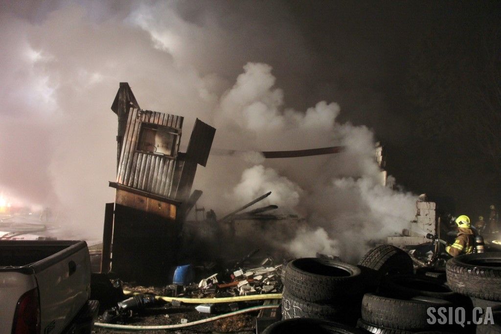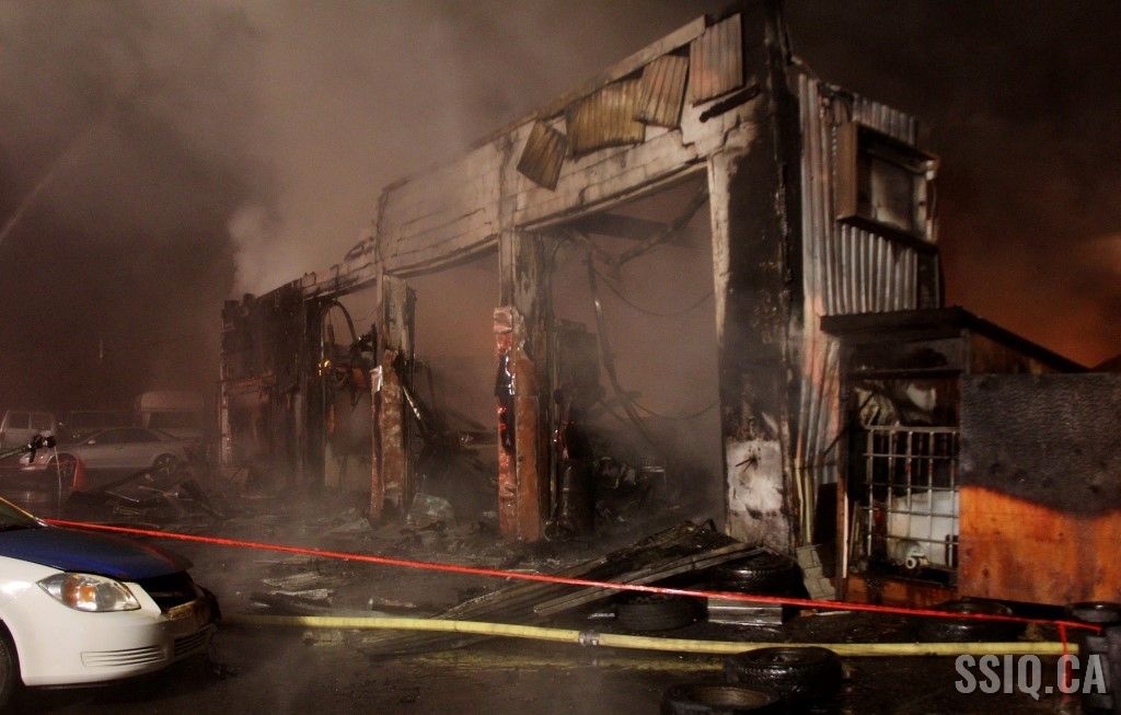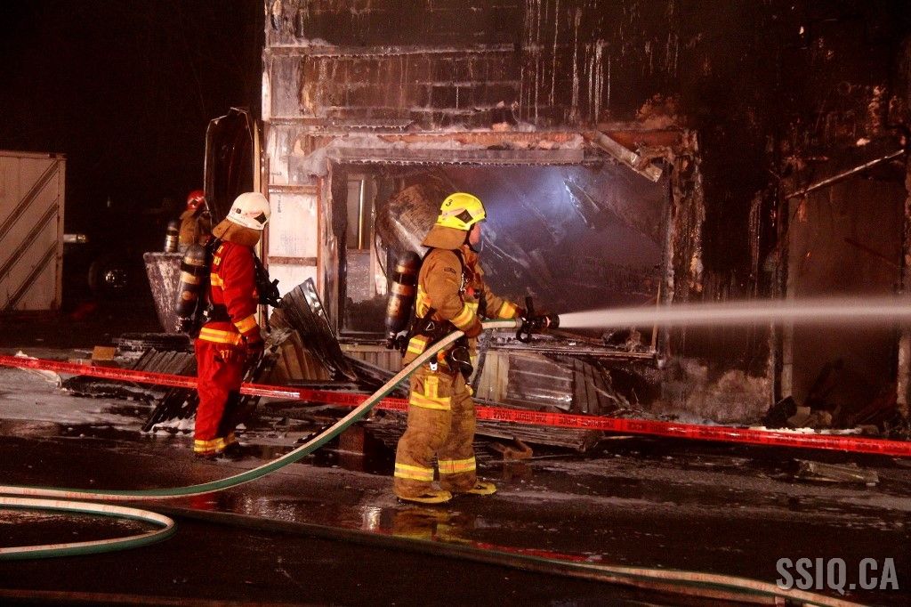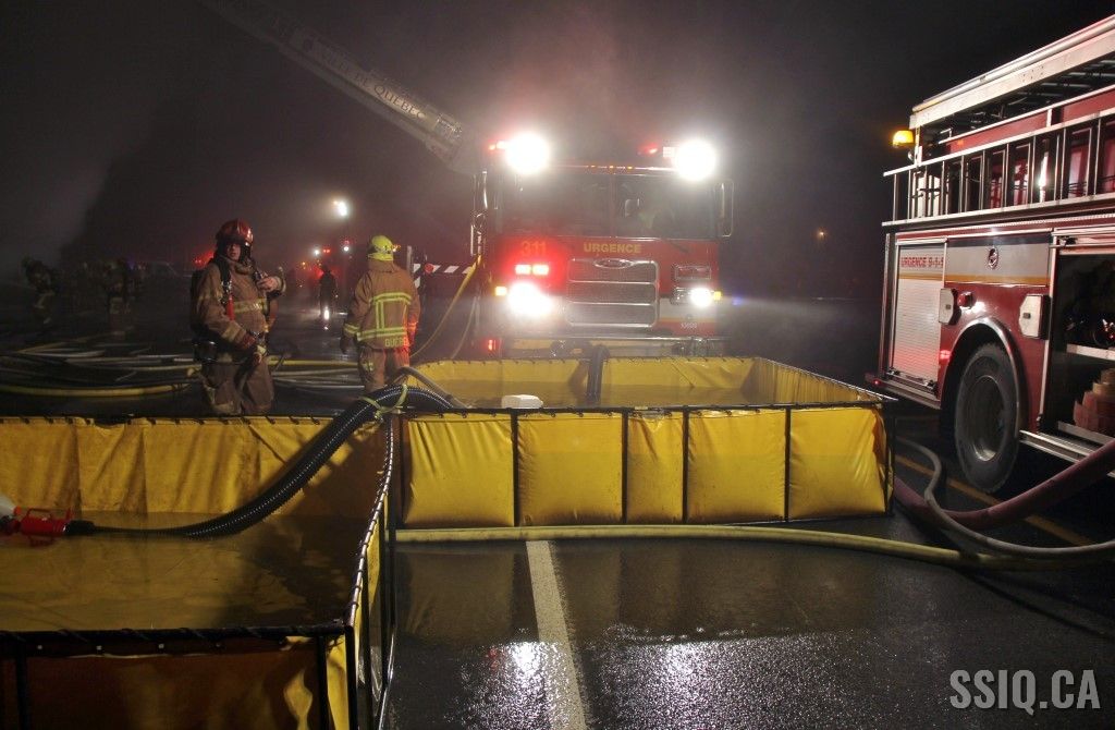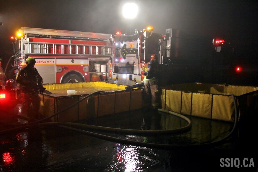 L’officier du 311 arrive sur les lieux et corrobore les informations déjà données sur les ondes. De nombreux véhicules sont dans le garage et brulent avec violence. Comme l’édifice se trouve dans une zone sèche, une source d’alimentation en eau avec piscines est nécessaire. Dès le début de l’intervention, il était clair que le bâtiment serait une perte totale. Les équipes travaillent en mode défensive étant donné les dangers d’explosion et aussi d’effondrement de la structure. Une pelle mécanique est demandée sur les lieux pour abattre ce qui reste des murs. On ne déplore heureusement aucun blessé. Fait à noter, un brouillard très épais recouvrait toute la région, ce qui rendait problématique l’approche des véhicules d’urgence.