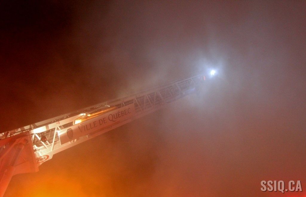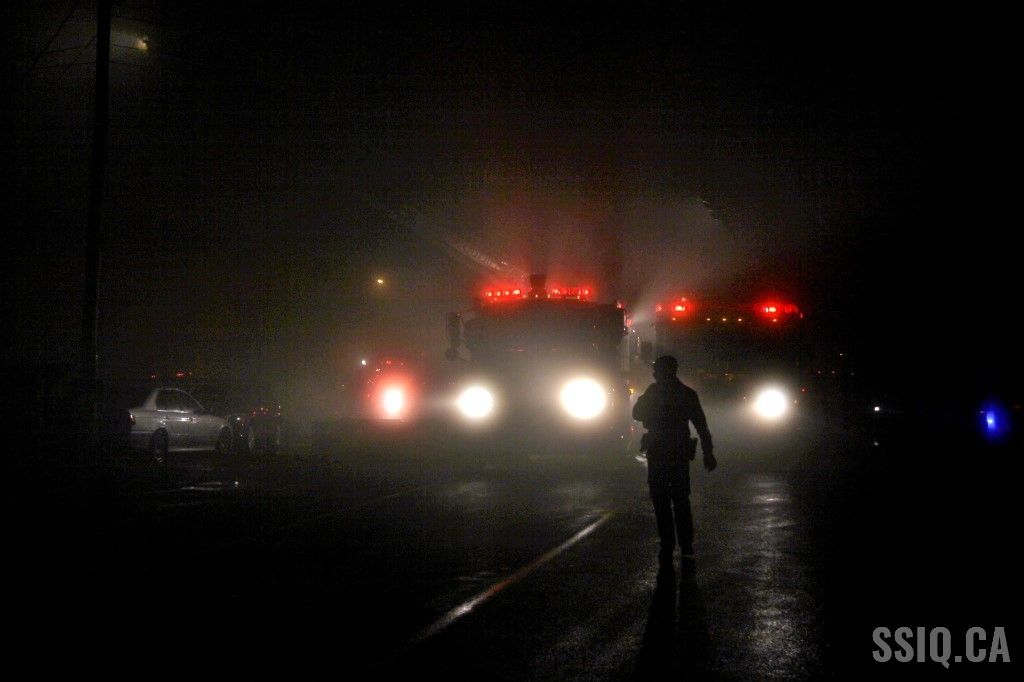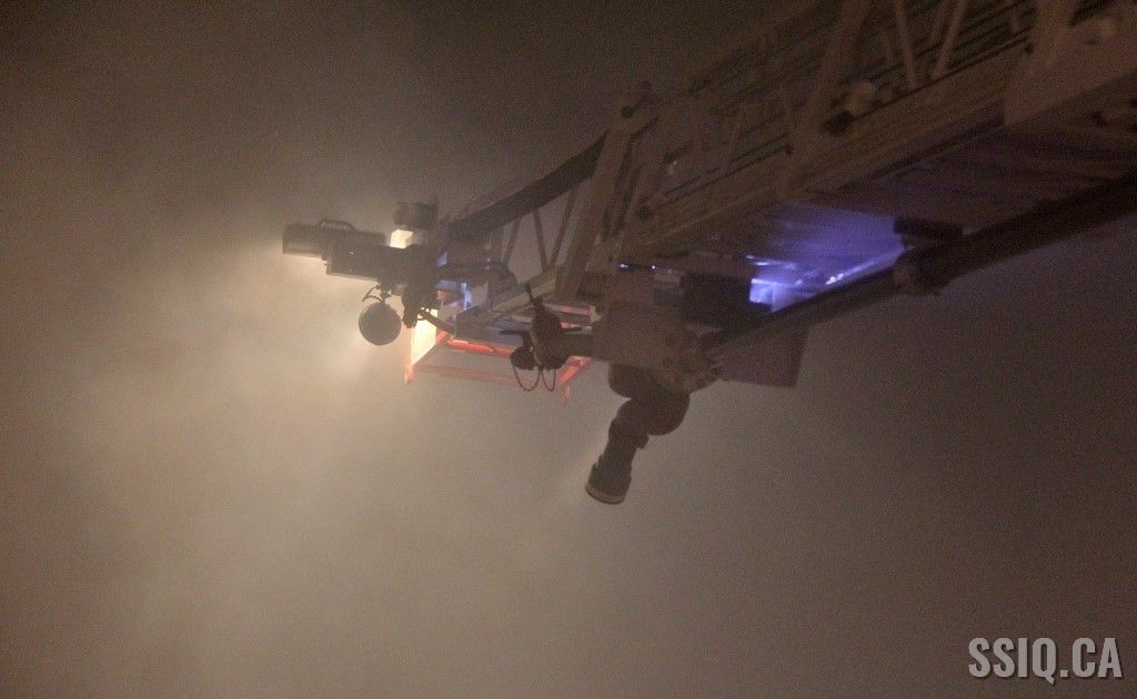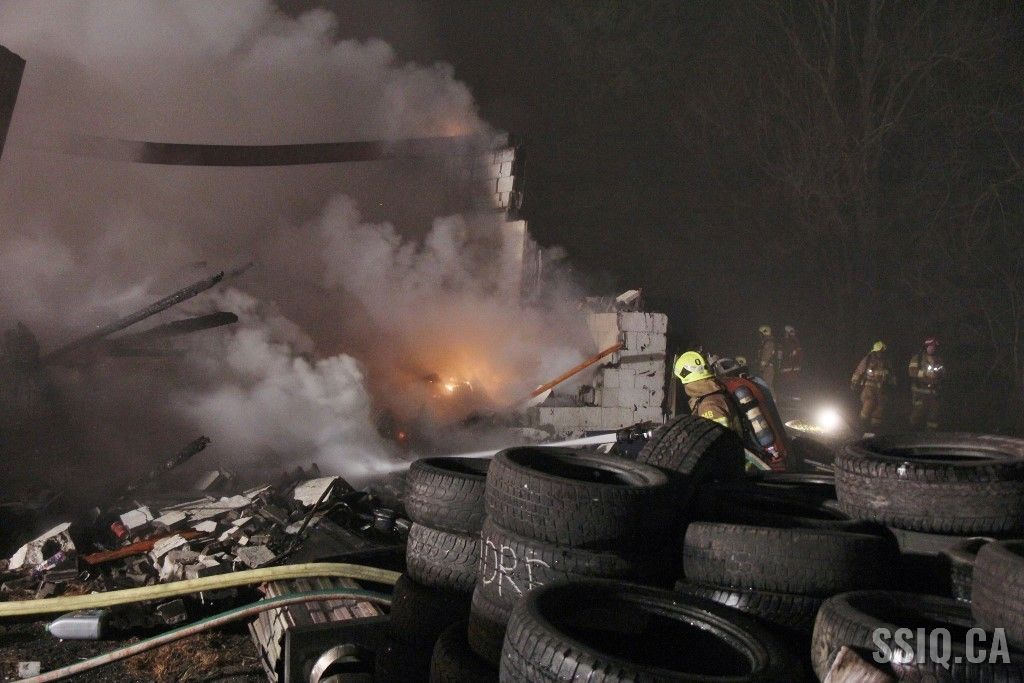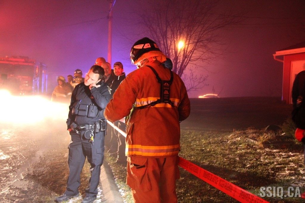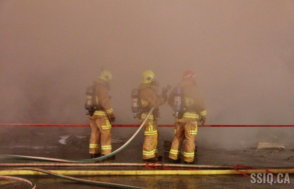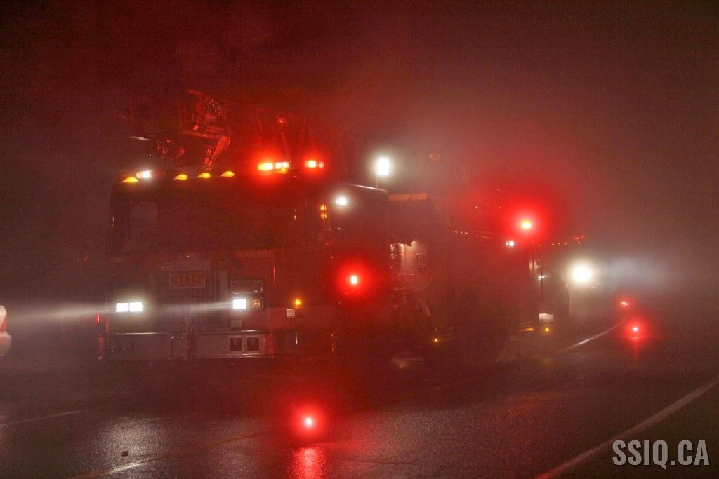 L’officier du 311 arrive sur les lieux et corrobore les informations déjà données sur les ondes. De nombreux véhicules sont dans le garage et brulent avec violence. Comme l’édifice se trouve dans une zone sèche, une source d’alimentation en eau avec piscines est nécessaire. Dès le début de l’intervention, il était clair que le bâtiment serait une perte totale. Les équipes travaillent en mode défensive étant donné les dangers d’explosion et aussi d’effondrement de la structure. Une pelle mécanique est demandée sur les lieux pour abattre ce qui reste des murs. On ne déplore heureusement aucun blessé. Fait à noter, un brouillard très épais recouvrait toute la région, ce qui rendait problématique l’approche des véhicules d’urgence.