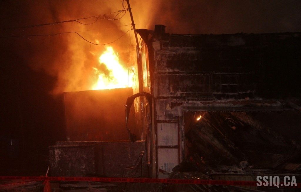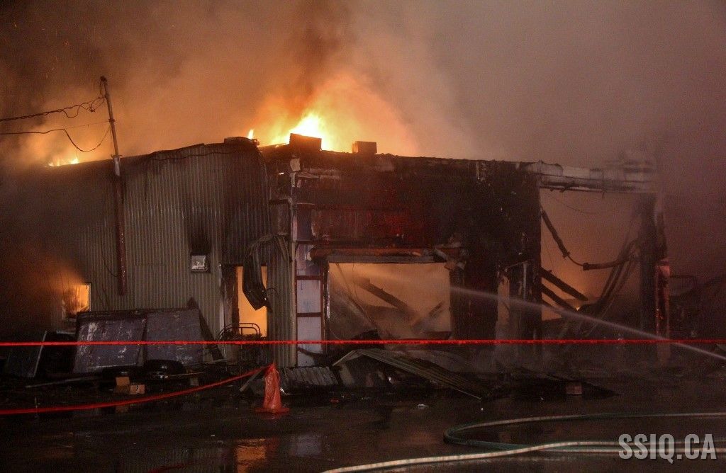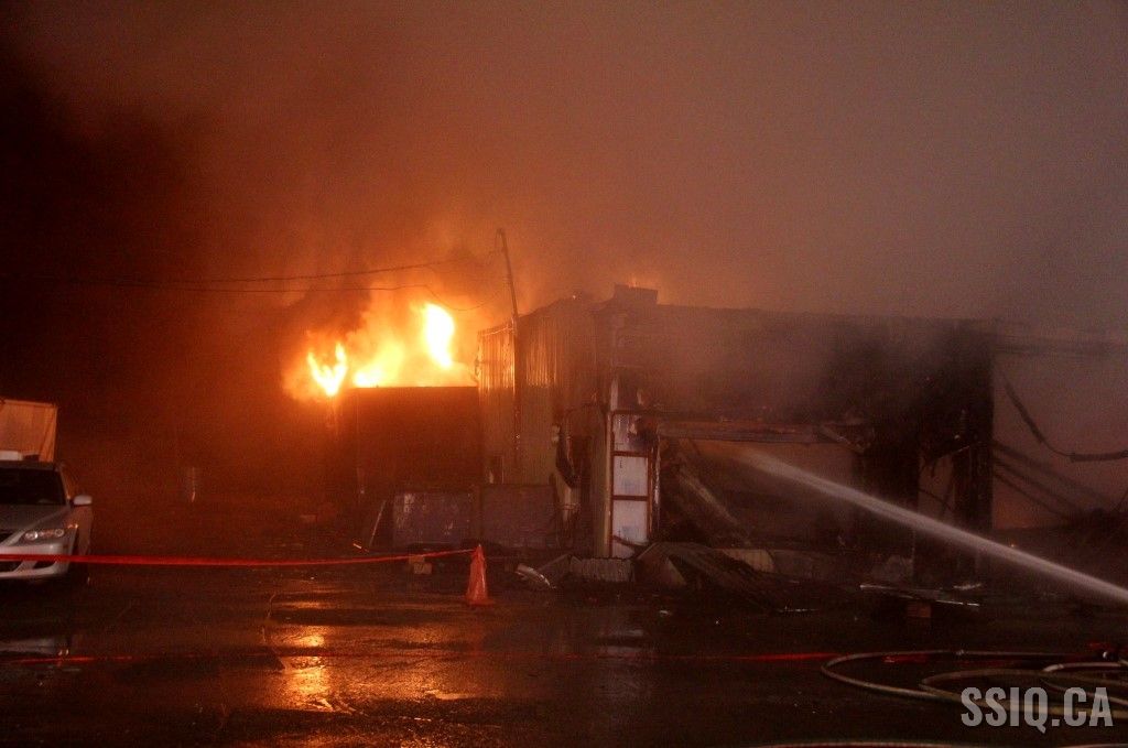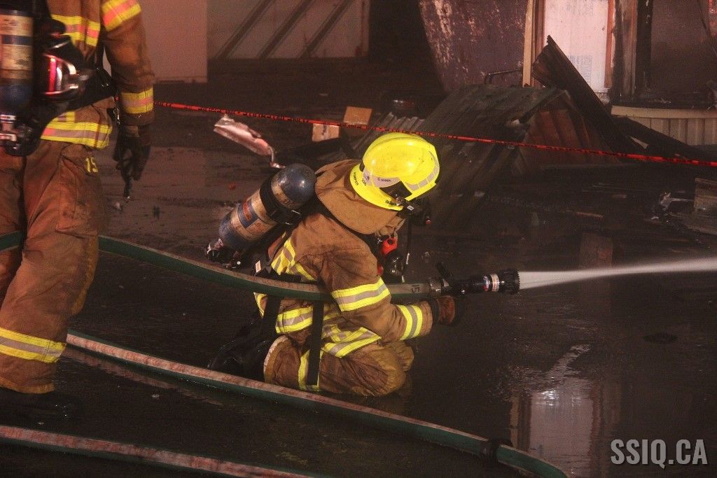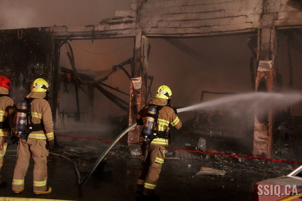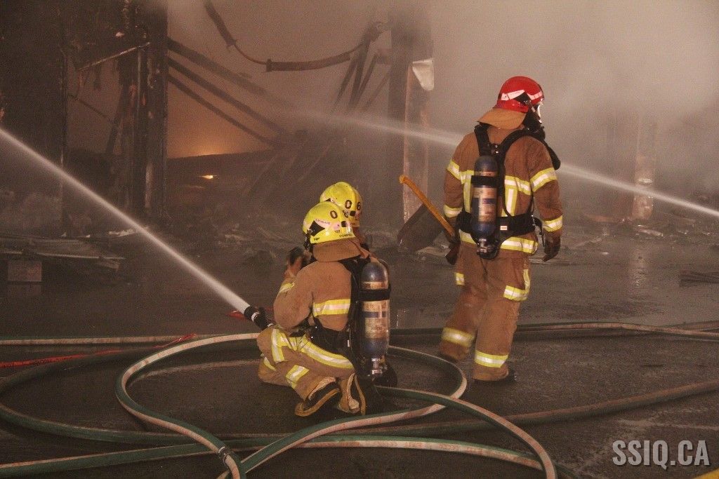 L’officier du 311 arrive sur les lieux et corrobore les informations déjà données sur les ondes. De nombreux véhicules sont dans le garage et brulent avec violence. Comme l’édifice se trouve dans une zone sèche, une source d’alimentation en eau avec piscines est nécessaire. Dès le début de l’intervention, il était clair que le bâtiment serait une perte totale. Les équipes travaillent en mode défensive étant donné les dangers d’explosion et aussi d’effondrement de la structure. Une pelle mécanique est demandée sur les lieux pour abattre ce qui reste des murs. On ne déplore heureusement aucun blessé. Fait à noter, un brouillard très épais recouvrait toute la région, ce qui rendait problématique l’approche des véhicules d’urgence.