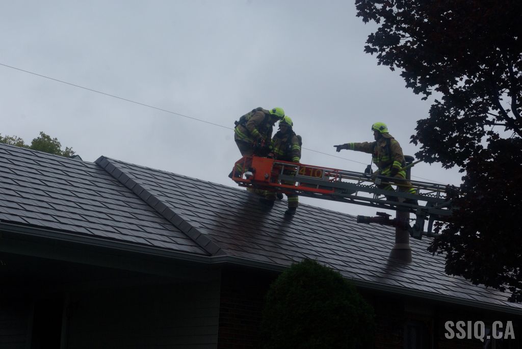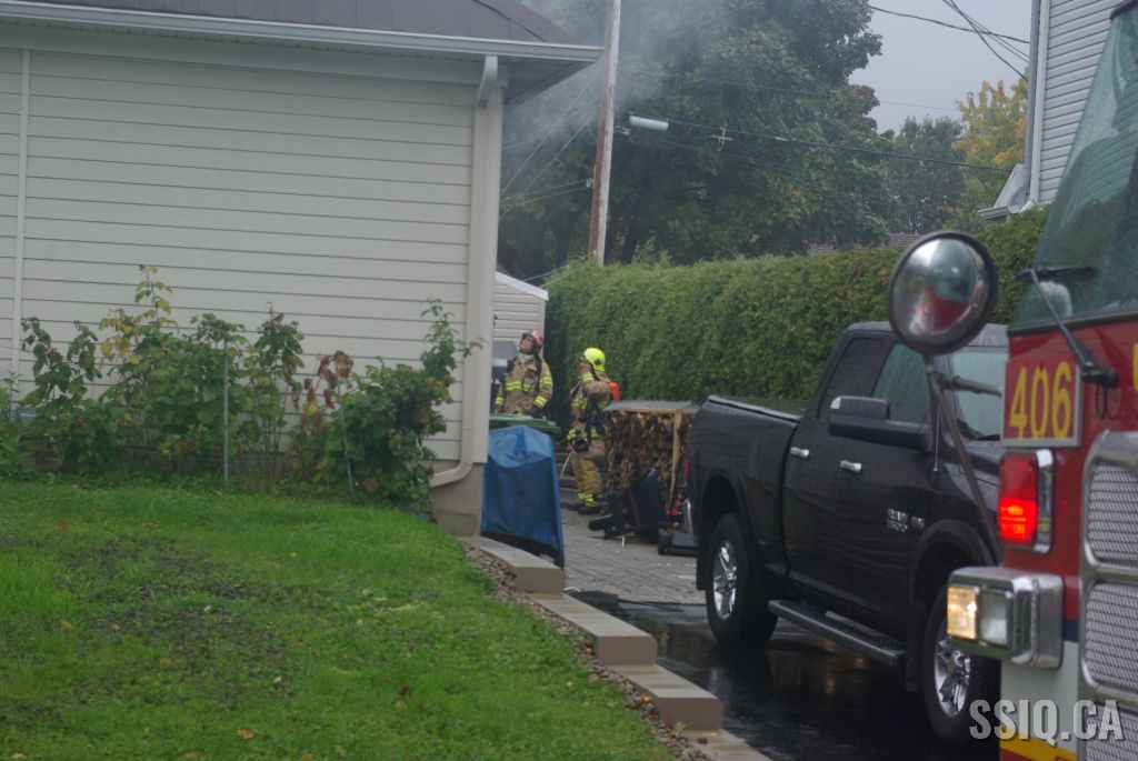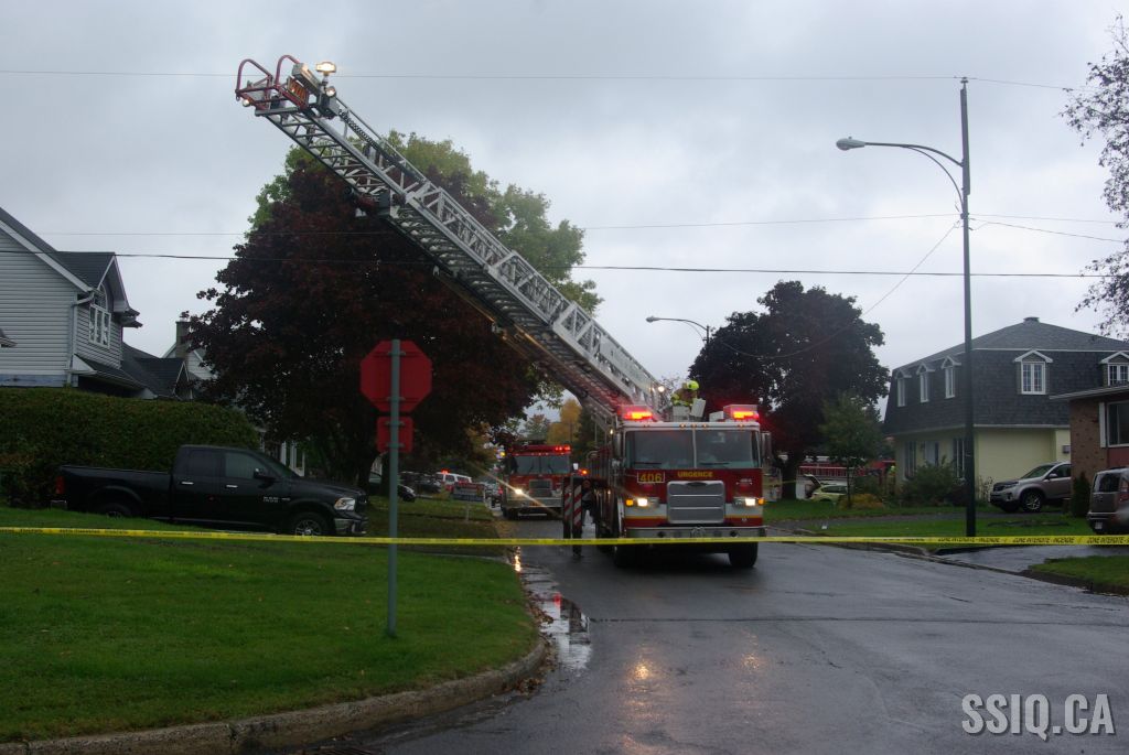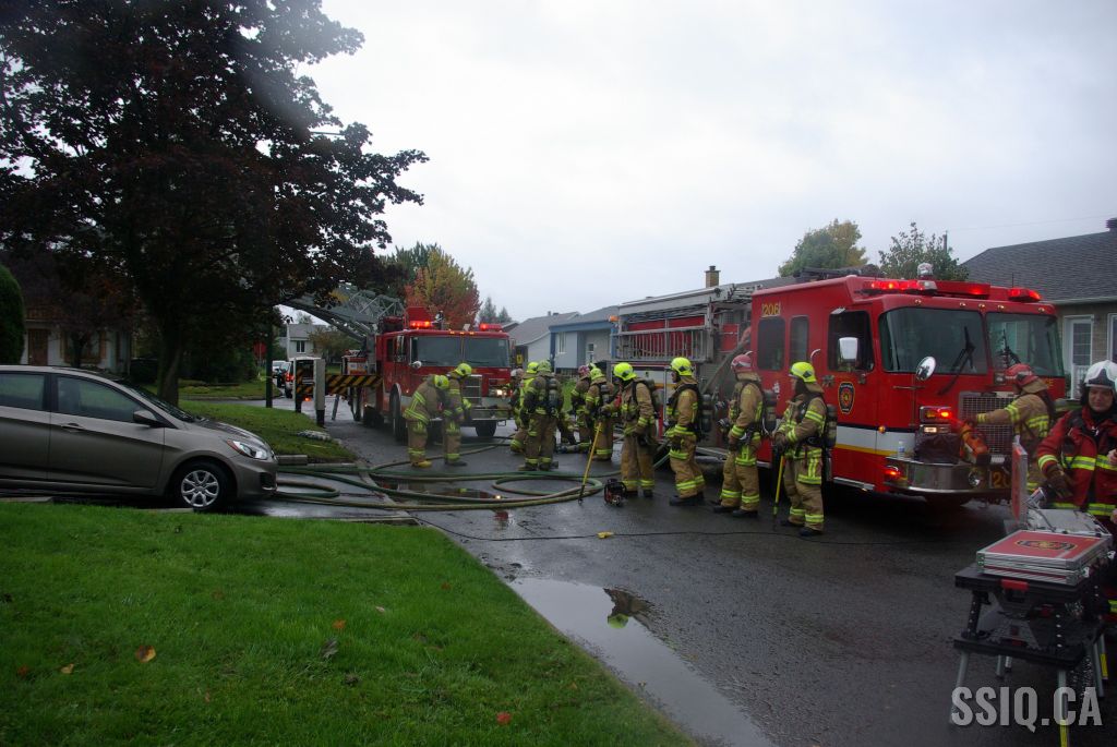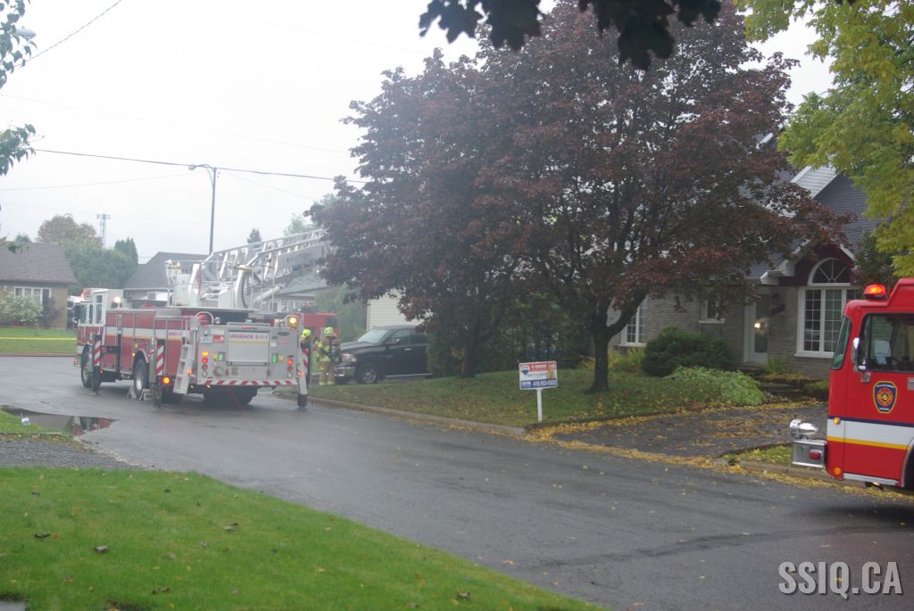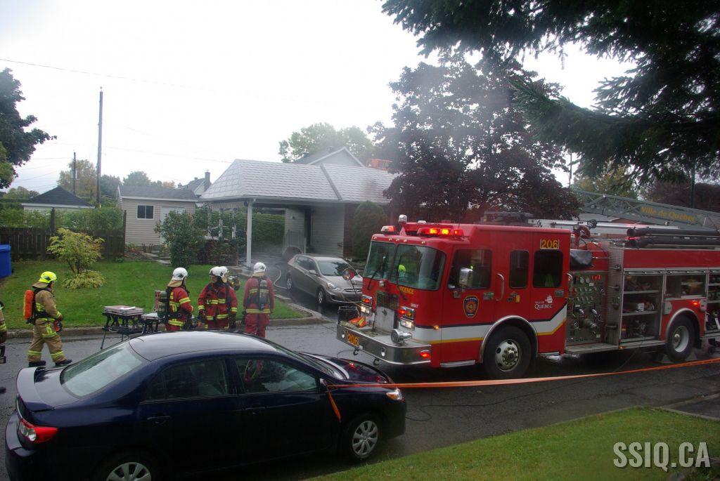 Le résident de la maison appelle pour mentionner que le feu est pris dans le plafond et que de la fumée s'échappe de l'échangeur d'air au sous-sol. De nouveaux détails font mention que la fumée sort également par la cheminée. L'officier du 206 arrivé sur les lieux rapporte que de la fumée jaune et grise sort d'un peu partout de la couverture. Il demande l'intervention nécessaire.
