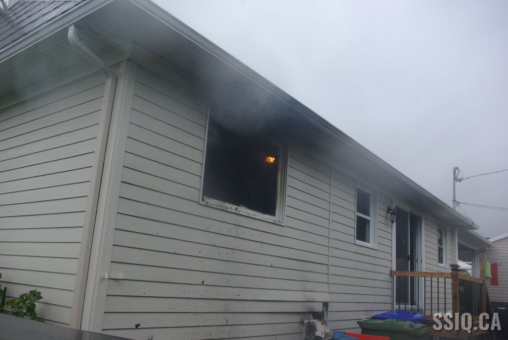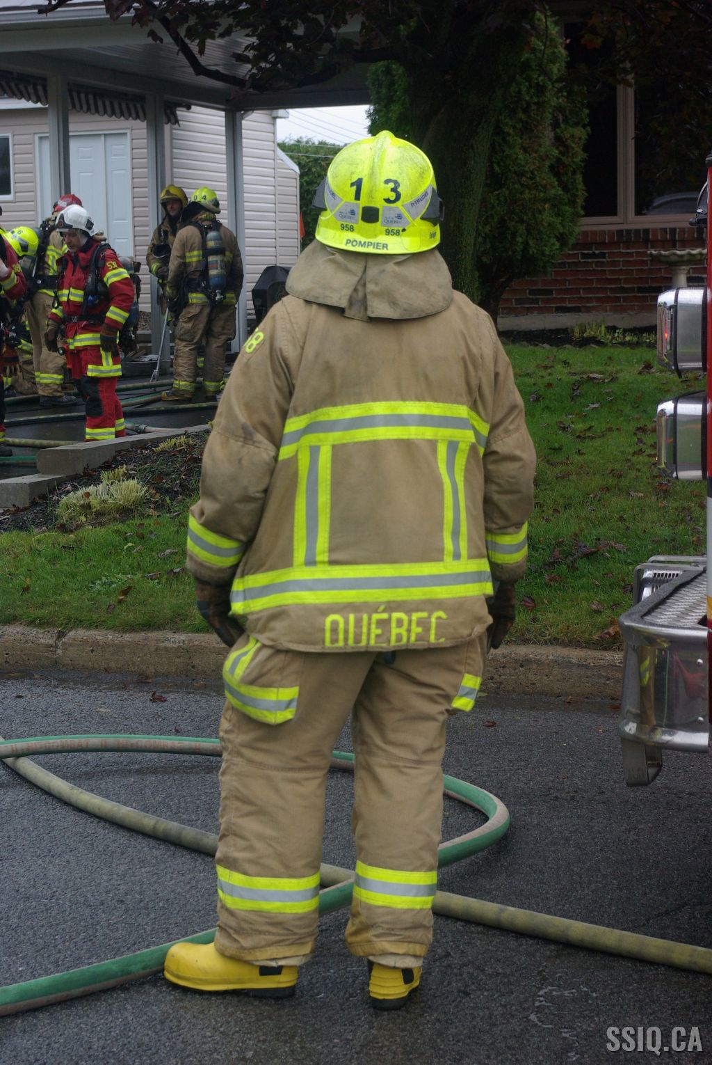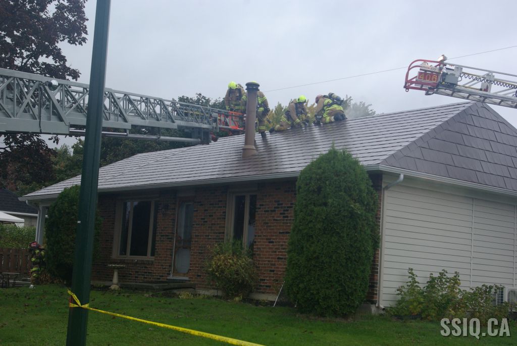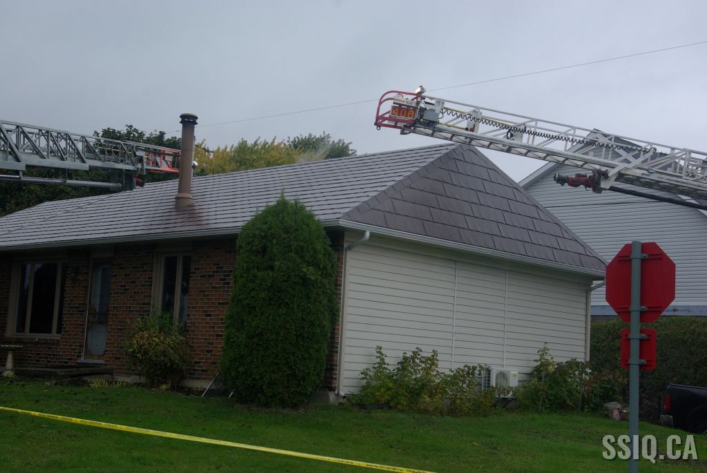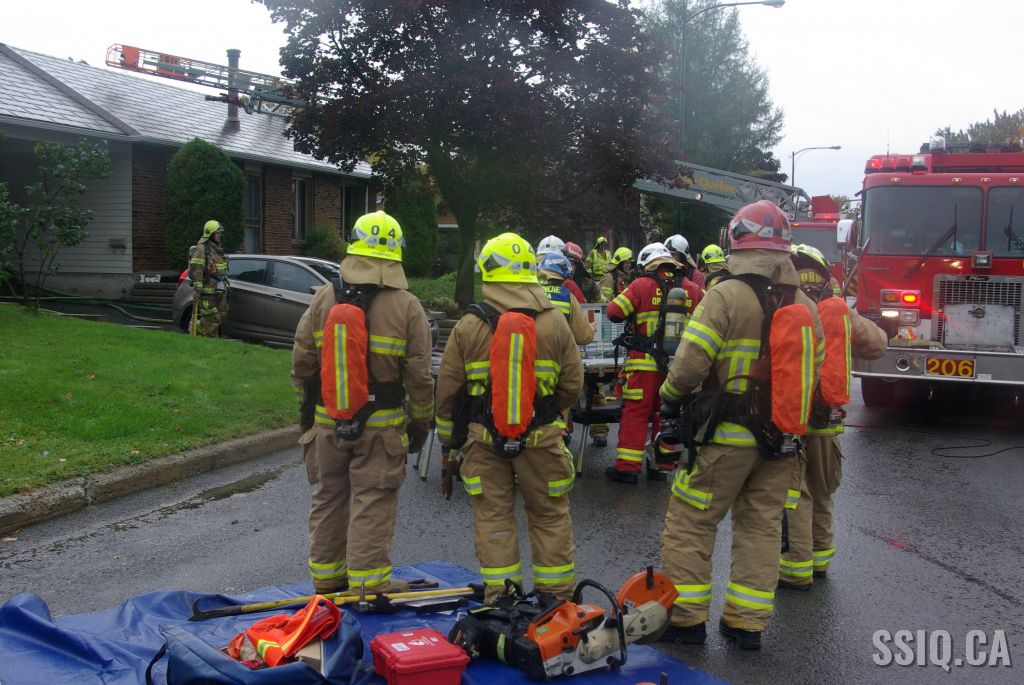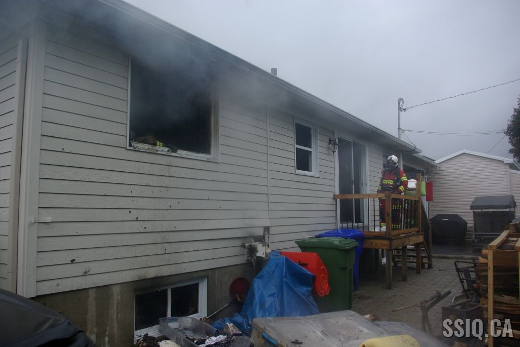 Le résident de la maison appelle pour mentionner que le feu est pris dans le plafond et que de la fumée s'échappe de l'échangeur d'air au sous-sol. De nouveaux détails font mention que la fumée sort également par la cheminée. L'officier du 206 arrivé sur les lieux rapporte que de la fumée jaune et grise sort d'un peu partout de la couverture. Il demande l'intervention nécessaire.