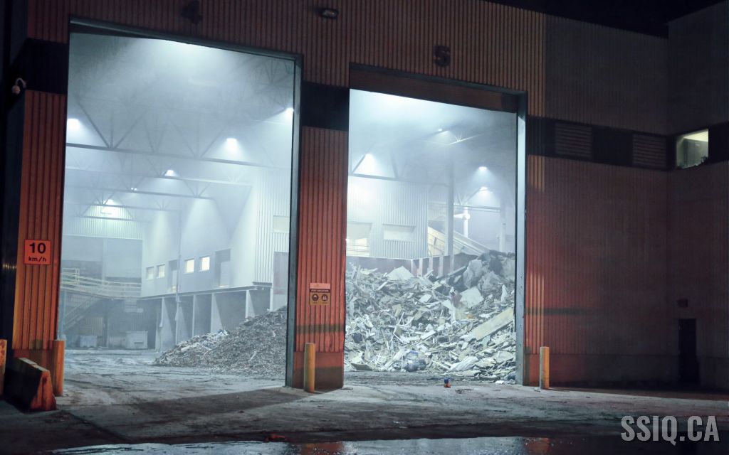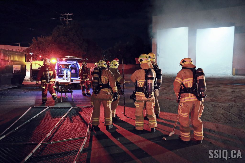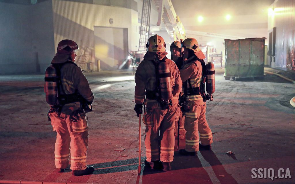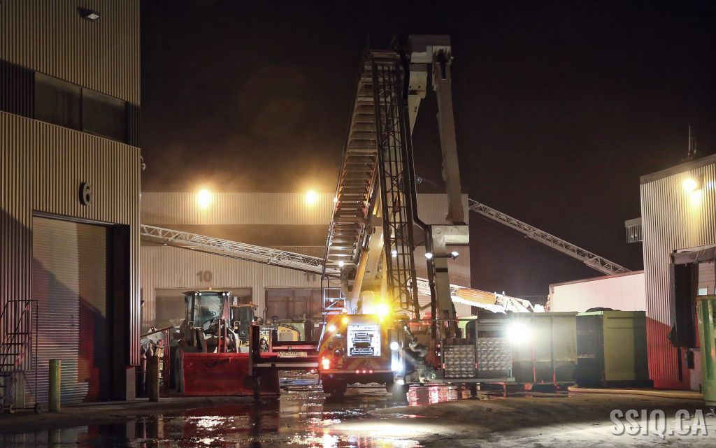L'incendie se situant dans des déchets à l'intérieur du bâtiment, les équipes de la 1ere alarme établissent des jets pour attaquer l'incendie de l'extérieur.
