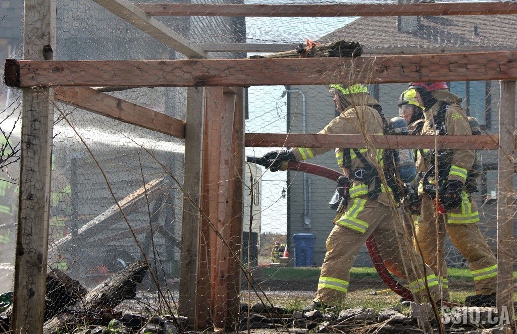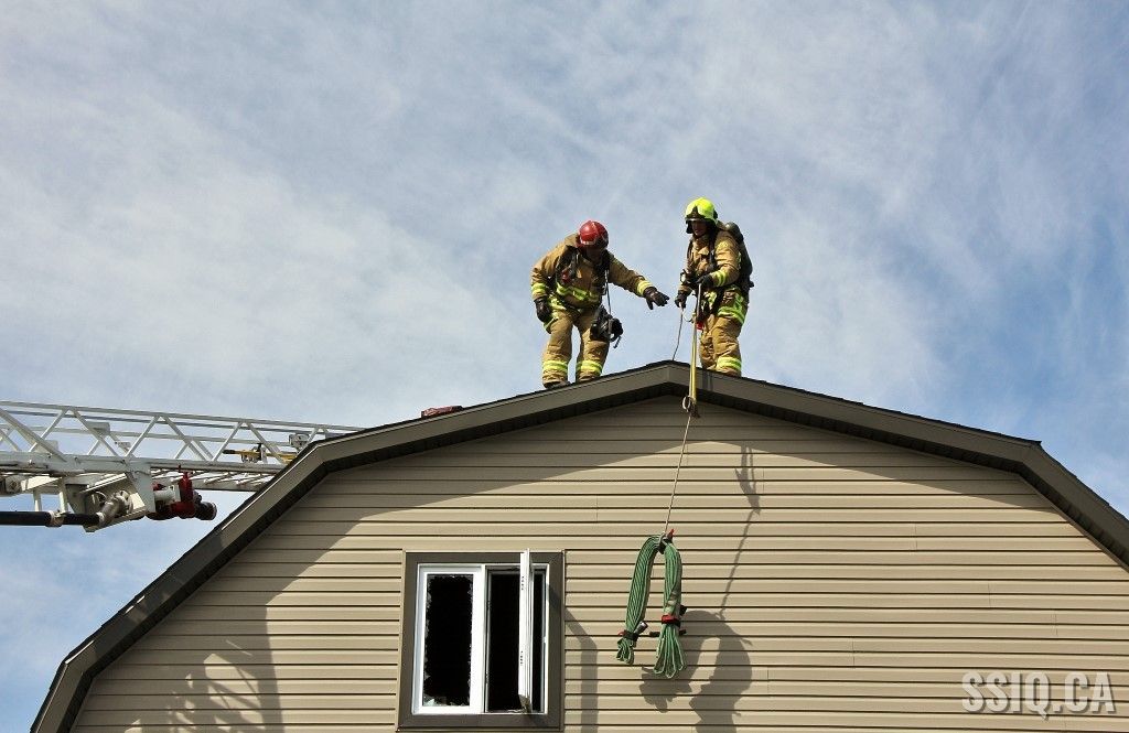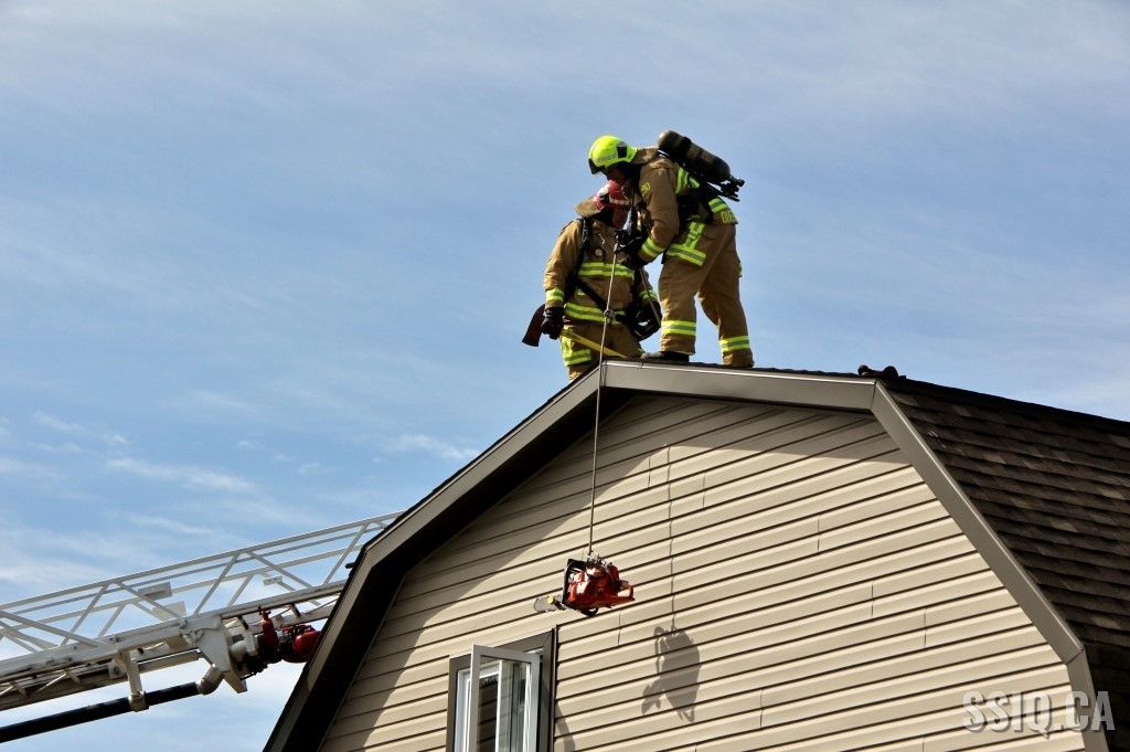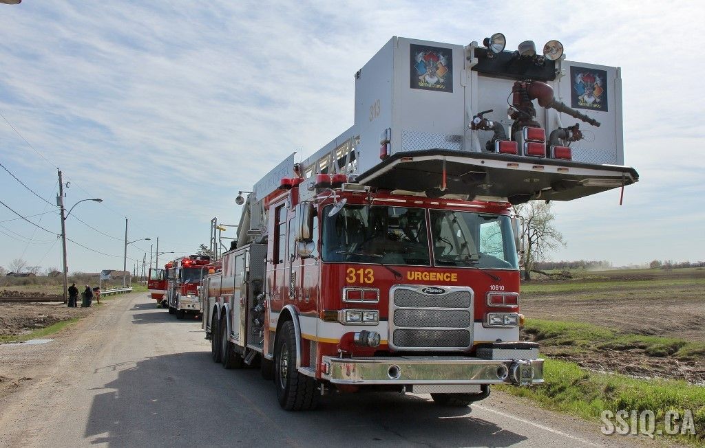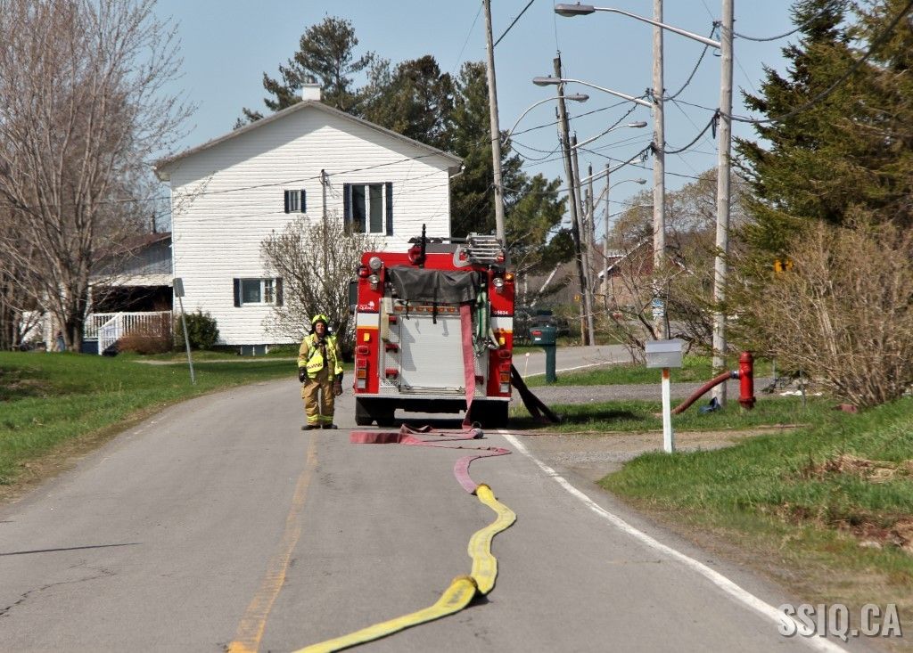 L'appel entre au 9-1-1 par une passante qui voit des flammes de 8 à 10 pieds derrière un garage de deux étages. Elle mentionne que le feu se propage à la partie arrière du garage.