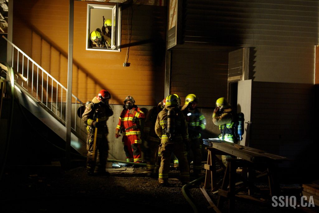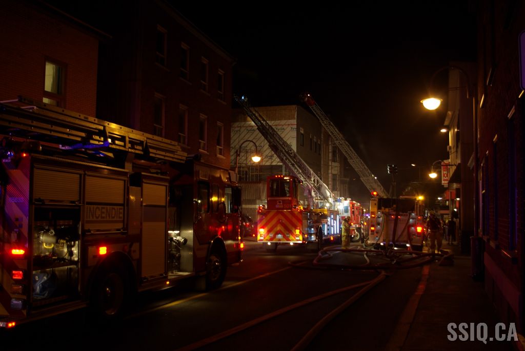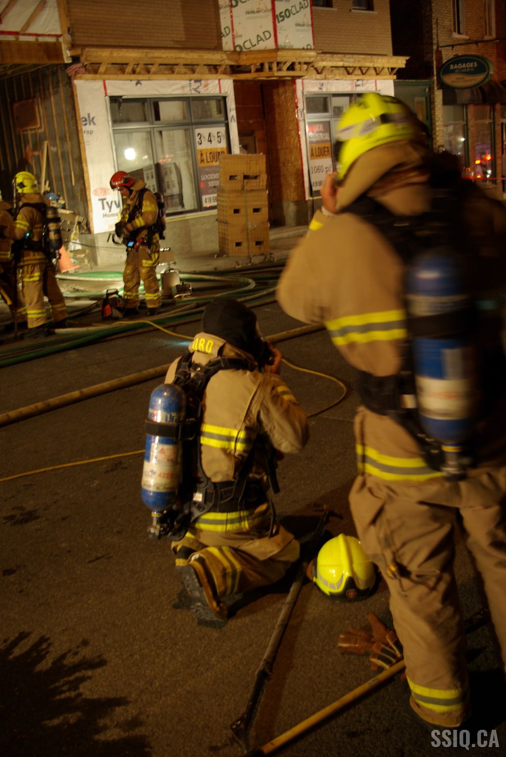 Le 203 arrivé le premier confirme la présence d'une épaisse fumée au premier étage, le feu faisant rage au sous-sol. Toutefois, en raison de la salle électrique et de nombreux équipements sous tension, le combat est difficile. Hydro-Québec est demandé en urgence.
