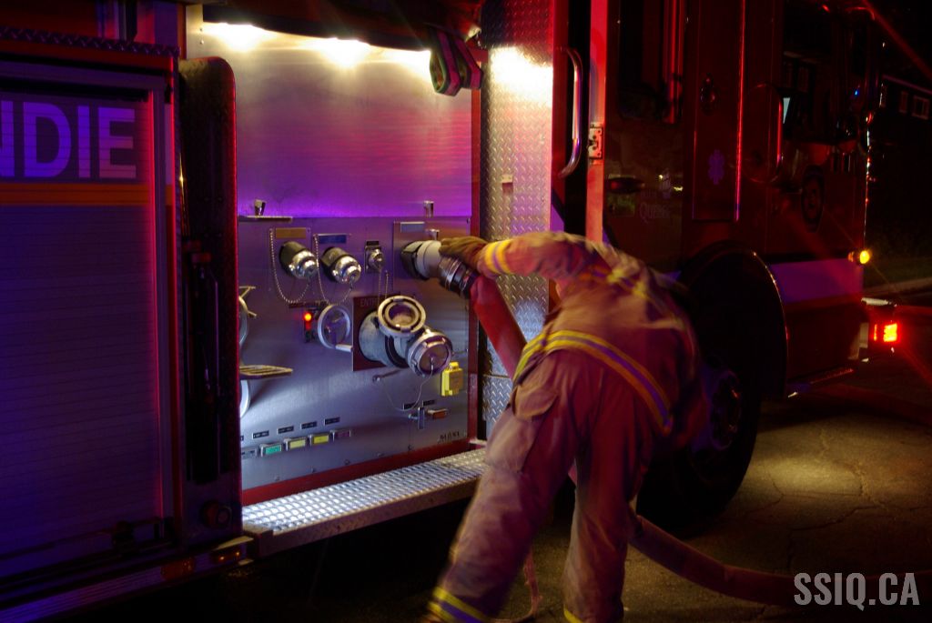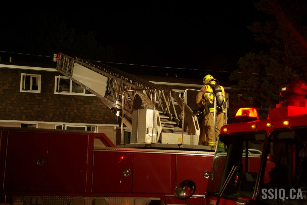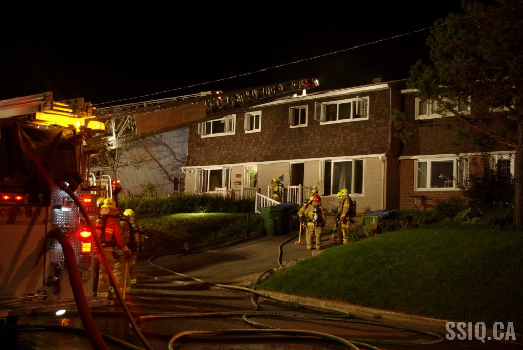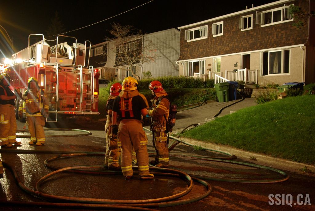 Le plaignant pense que le feu origine de sa sécheuse située au sous-sol de sa résidence. De la fumée est visible.