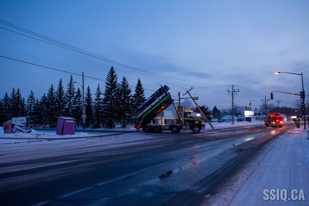 Sur place, l'officier du 305 confirme la situation. La benne du camion est demeurée relevée alors qu'il quittait les lieux, arrachant ainsi les fils de télécommunications et électriques. Sous la force de l'impact, un poteau d'Hydro-Québec a été sectionné en deux. Hydro-Québec est alors demandé en urgence.