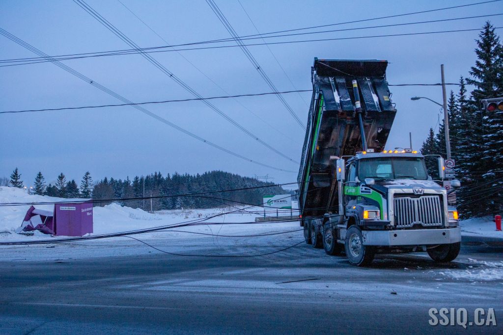 Plusieurs appels ont été logés à la centrale 911 par des témoins. Les détails font mention d'un camion benne coincé dans les fils électriques à la sortie du dépôt à neige.