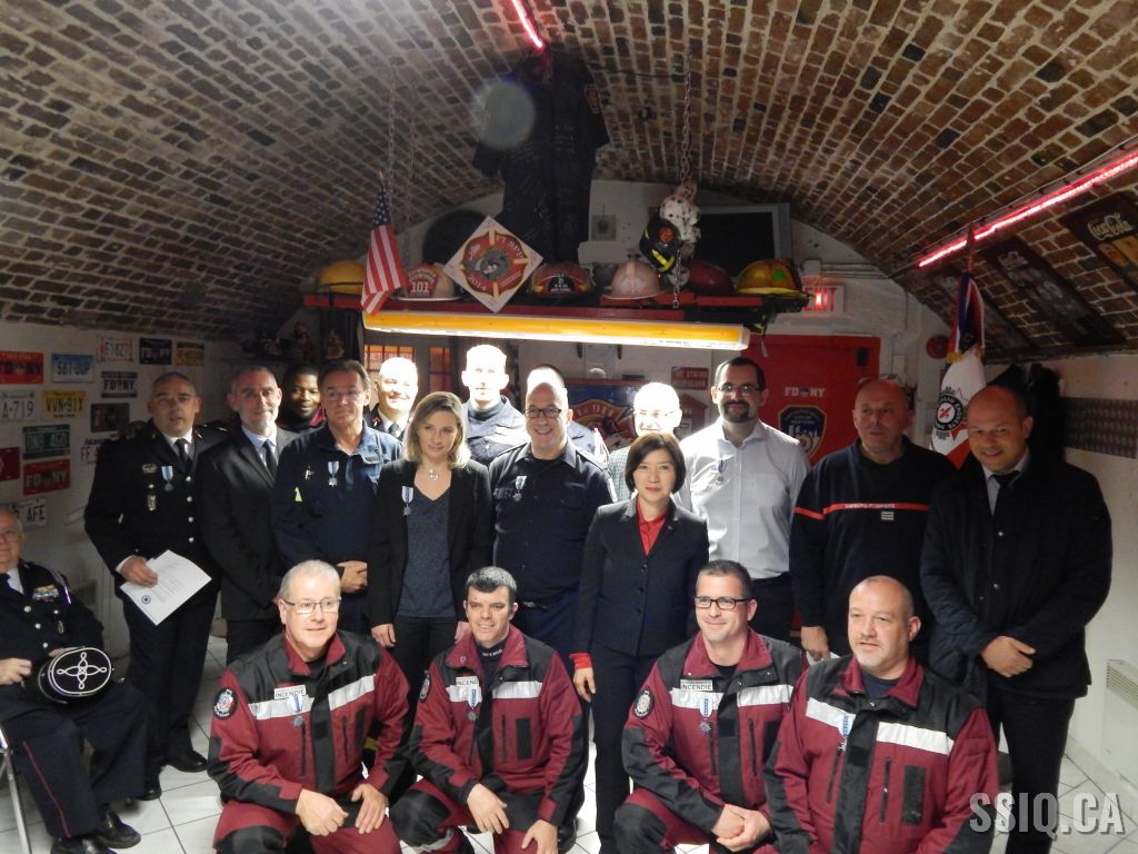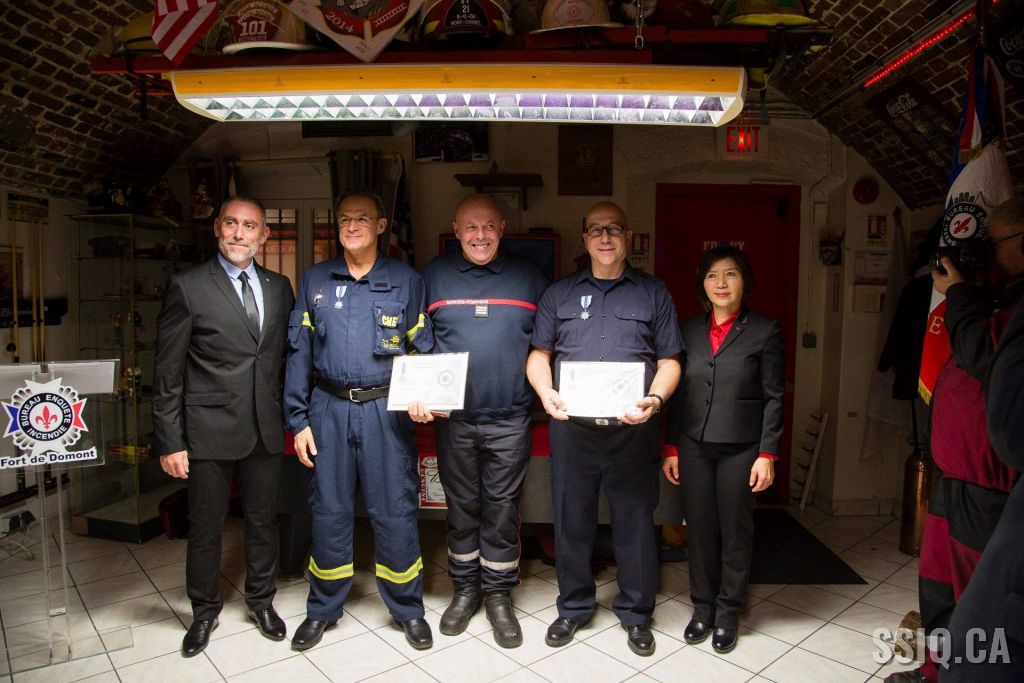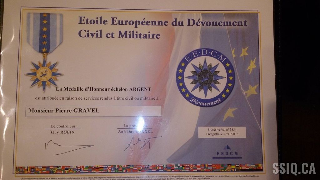 Le pompier Pierre Gravel du SPCIQ a été décoré de l'Étoile Européenne du Dévouement Civil et Militaire par Anh Dao Traxel, présidente de l'ordre.