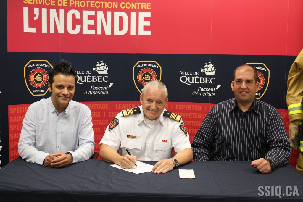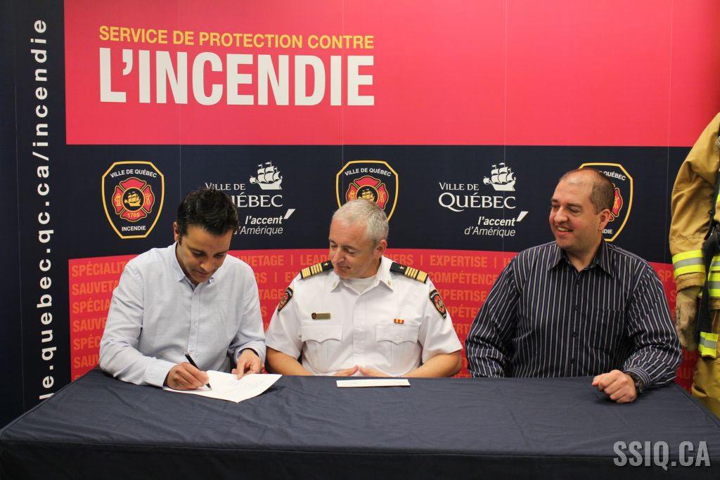 En ce lundi 7 août 2017, les administrateurs de SSIQ.ca (Carl L'Heureux, Arnaud Courti et Olivier Marcoux, absent des photos) ont signé l'entente de partenariat avec le Service de Protection contre l'Incendie de la Ville de Québec. Cette entente est valide pour deux ans.