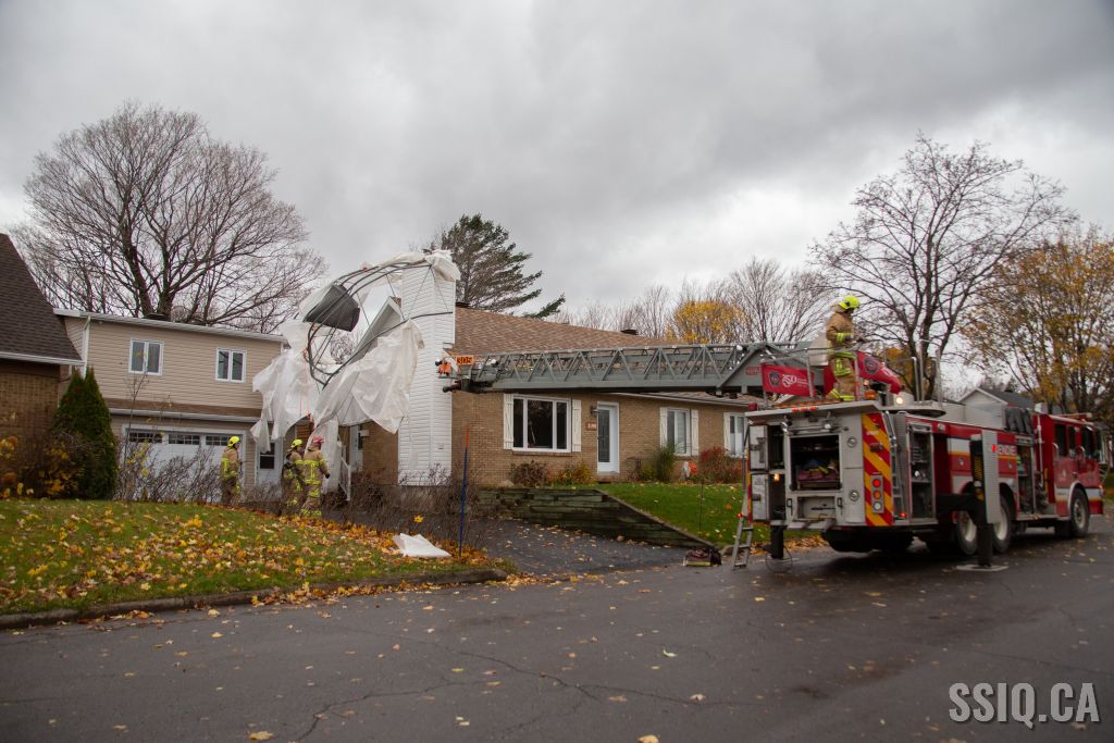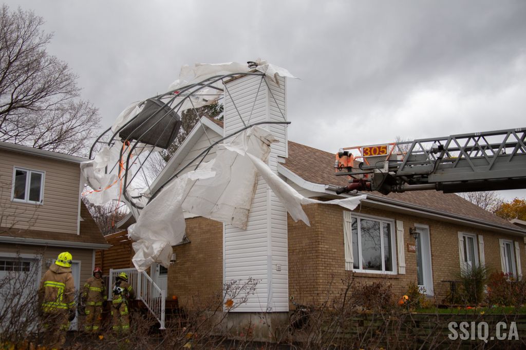 Sur les photos, l'équipe du 305 était au 3190 rue Arsenault, dans l'arrondissement Les Rivières, pour un abri d'auto qui à été emporté par le vent, et qui est resté accroché sur la cheminée et l'entrée électrique de la maison.