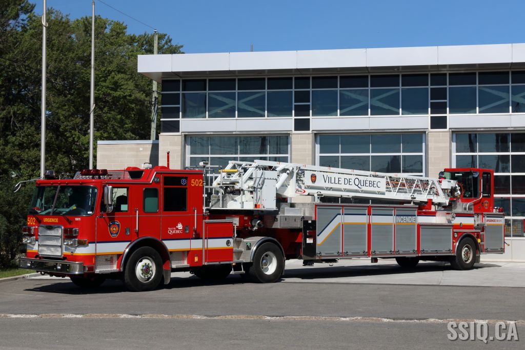 Échelle à timonier. Construit par Pierce sur chassis Arrow XT 2013 avec échelle en acier de 105 pieds.